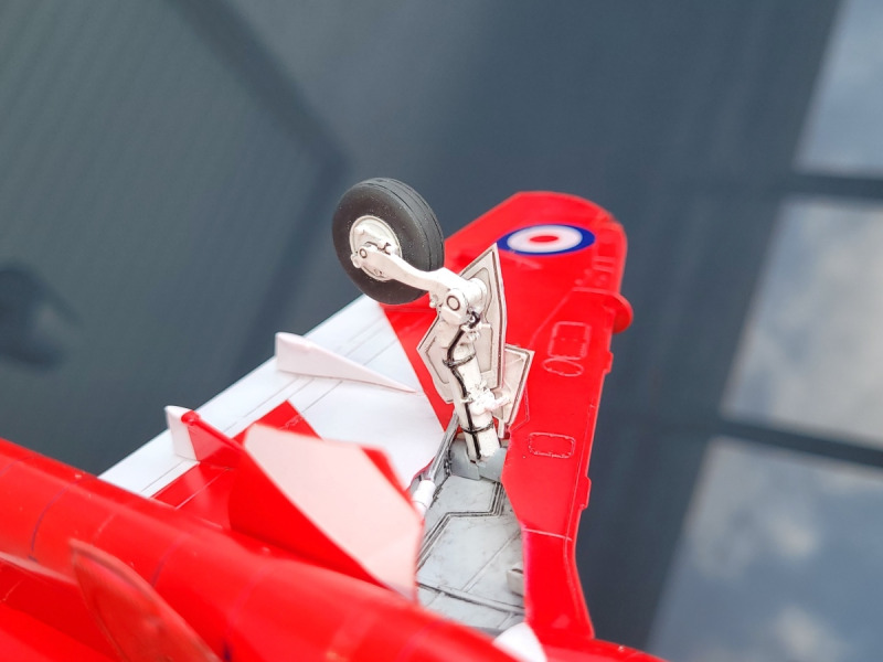 Die Decals waren hingegen mehr schlecht als recht. Sehr schlecht gedruckt, das Weiß war überhaupt nicht deckend und hatte eher etwas von einen Stück Emmentaler als von einer dichten, deckenden Fläche. Also wurden alle Streifen (und die Roundels teilweise) nachlackiert. Am Fahrwerk habe ich dann noch ein paar Leitungen ergänzt.