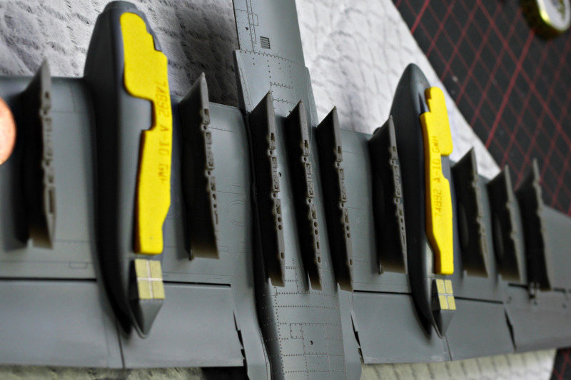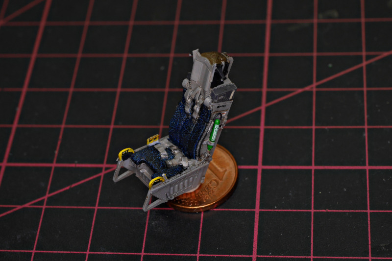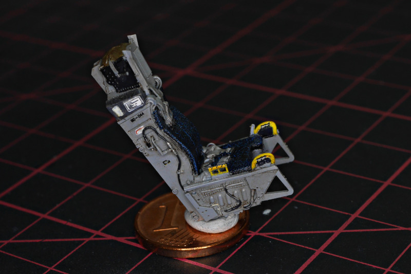 Das ZubehörAls Zubehör kamen noch Masken von Art Scale Kit dazu, 3D-Decals für das Cockpit, ein Schleudersitz aus Resin, ein Fahrwerk von Detail&Wonder mit sehr schönen Details (man beachte die unglaublichen LED-Landescheinwerfer!), der passende Ätzteilsatz von Eduard, das Pitot aus Metall. Da diese Sonderlackierung kaum beladen geflogen ist, die Pylone des Kits aber wenig Details tragen, habe ich noch ein Set von Aires dafür genutzt. Sehr praktisch fand ich auch die Wheel bay plugs von Omask, die ich hier erstmals in die Fahrwerksschächte gestopft habe.