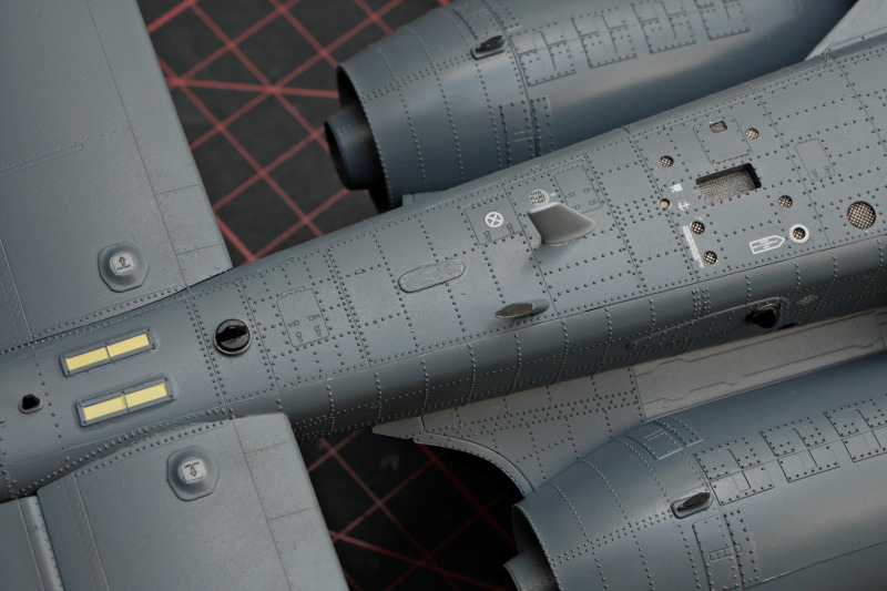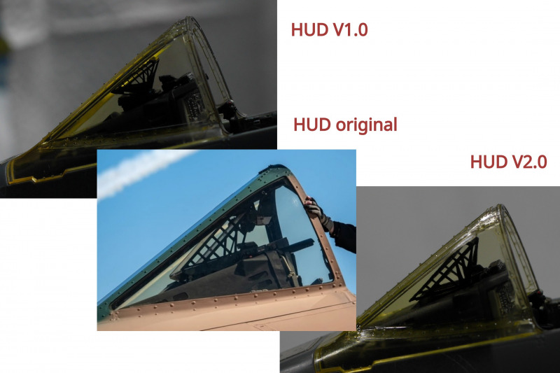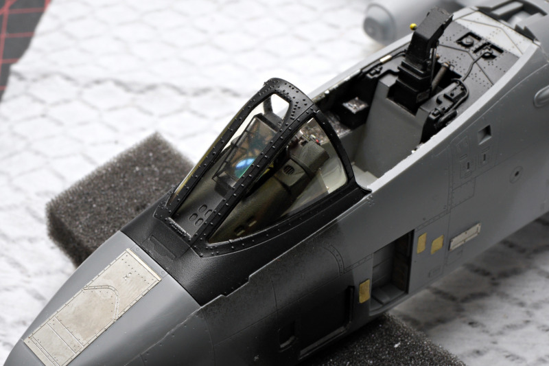 Der BauBeim Ätzteilsatz habe ich jedoch die grob geätzten Gitter durch sehr feines Edelstahlgewebe ersetzt, welches ich auf einer Ausstellung erwerben konnte. Leider hat Eduard auch das HUD versemmelt, es ist viel zu klein! Das ist völlig unverständlich, denn in den Sets für die A-10 anderer Hersteller im gleichen Maßstab (z.B. für Hobby Boss) konnten sie es doch auch korrekt?! Warum wurden die Daten nicht übernommen oder nicht wenigstens bei der Qualitätssicherung einmal gegengecheckt? Sehr ärgerlich! Ich habe mir dann mit einem solchen HUD beholfen. Da das HUD sehr prominent sichtbar ist, hat mir das Klarsichtspritzteil aus dem Kit auch nicht gefallen, da wirkt der filigrane Metallrahmen deutlich schöner.