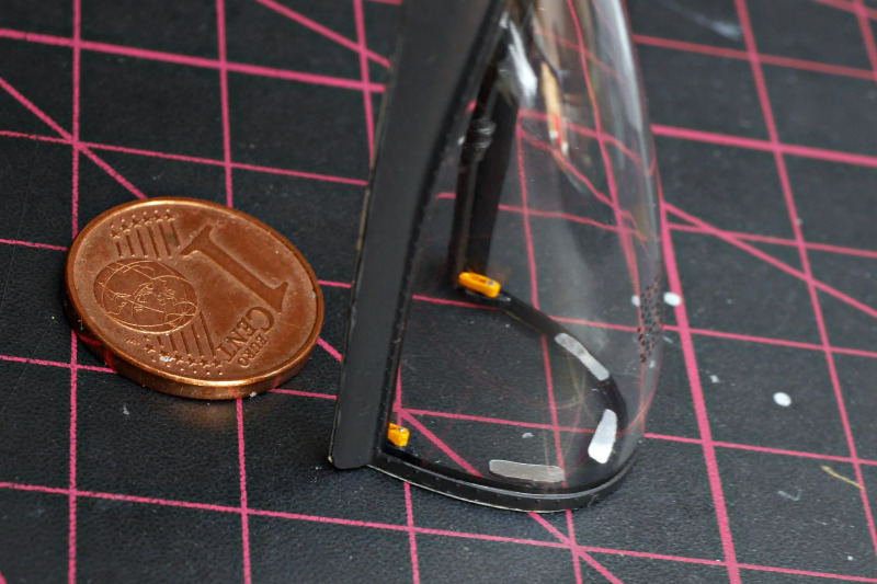Selbst bei so einem HiTec-Kit und dem Zubehör habe ich noch kleine Ergänzungen zum Scratchen gefunden, z.B. die Bolzen zum Aufbocken zur Wartung. Für die Fensterdichtung der Frontscheibe hat es funktioniert, Decalfolie zu lackieren und mit dem Schneidplotter in feinste Streifen zu schneiden. Es waren auch nicht alle Lampen als Klarteile enthalten. Weitere Kleinteile wie die gelben Öffnungshebel entstanden aus Evergreen-Material. Da es auch innerhalb der C-Reihe Umbauten gab, müssen für die "Blacksnake" einige Antennen anders angeordnet werden, aber im Bausatz ist alles enthalten.