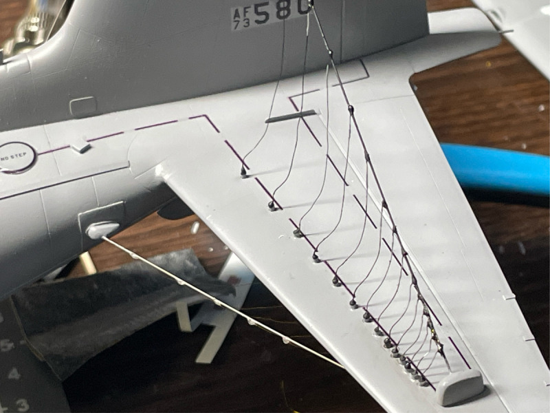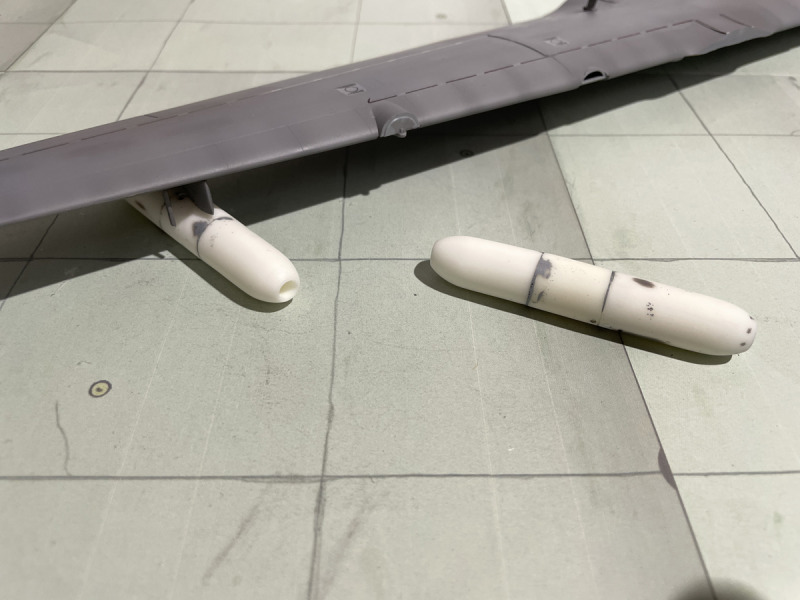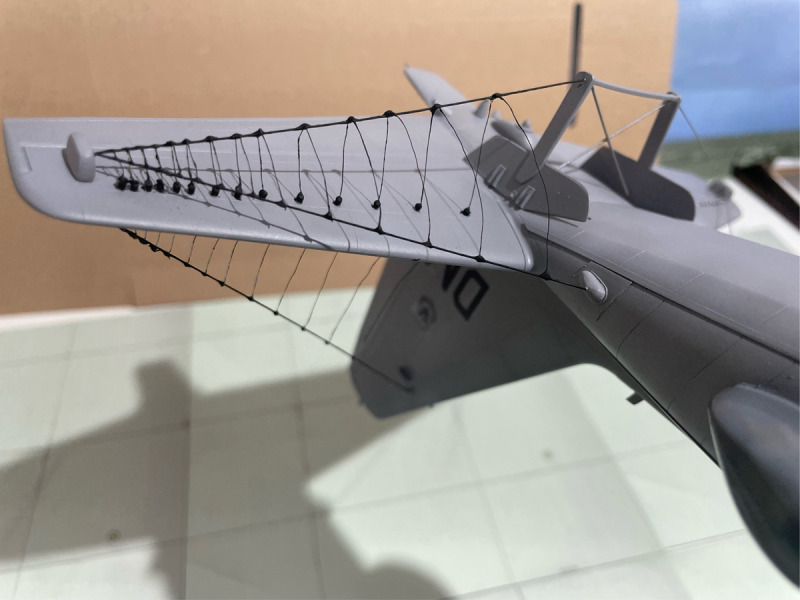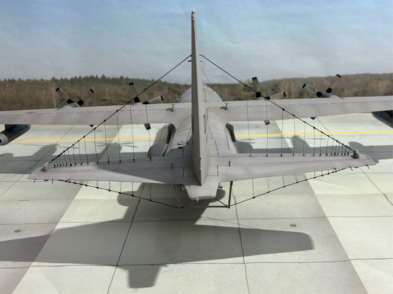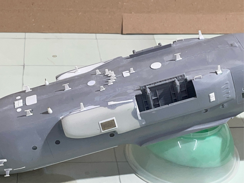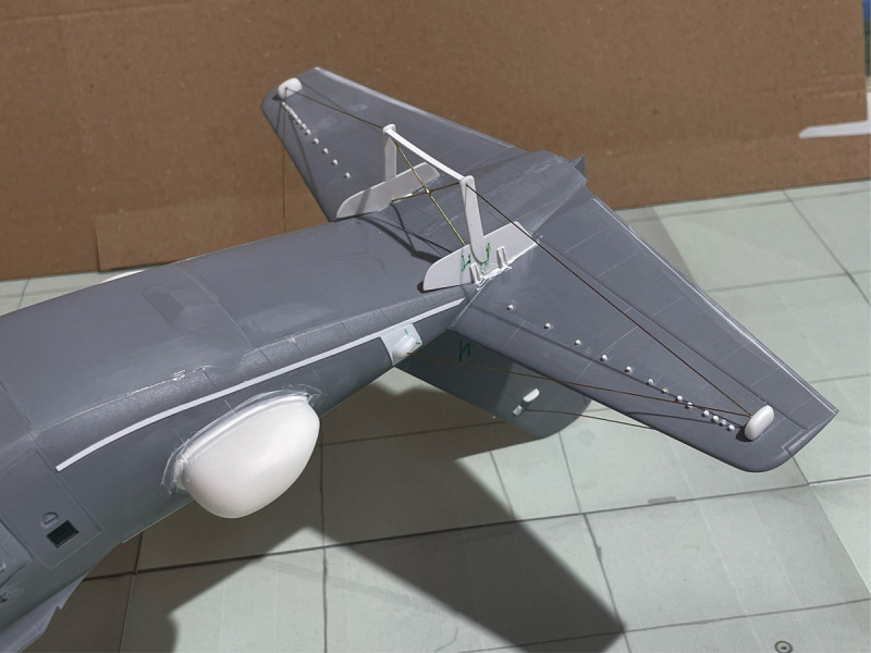 ...musste umfangreich mit vielen Verstärkungen, Domes, neuen Kühllufteinläufen und Antennen ausgerüstet werden. Da es keine Umbausätze gibt, musste eben wieder alles von Hand aufgebaut werden. Dazu kam - wie immer - meine klassische Bauweise mit Resin und Plastik-Sheets. Besonders herausfordernd war die Installation der Drahtantennen am Leitwerk, die aber erst nach der Lackierung des Rumpfes angebracht wurden. Ich lasse mal die Bilder sprechen.