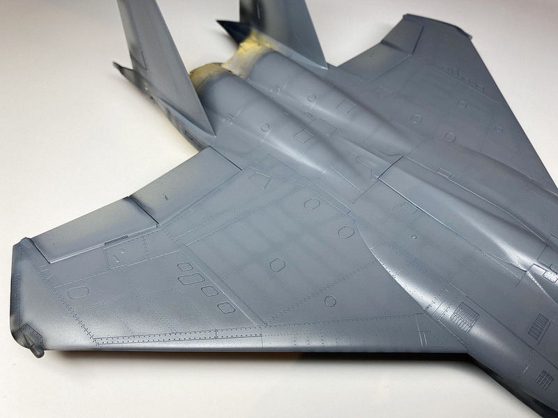 Für die Lackierung der für die Eagle typischen Zwei-Ton-Tarnung habe ich dieses Mal auf Real Colors Farben von AK Interactive zurückgegriffen – konkret RC 917 „Aggressor Grey“ FS 36251 und RC 915 „F-15 Dark Grey (MOD Eagle)“ FS 36176, die dem Original sehr nahekommen und ein schönes Spritzbild ergeben. Um die Maskierung der umfangreichen Tarnflächen zu beschleunigen, habe ich mir das wiederverwendbare Set von DN Models zugelegt. Den Naturmetall-Look am Heck und die Nozzles der Eagle habe ich mit Farben aus der Xtreme Metal Palette von AK dargestellt.
