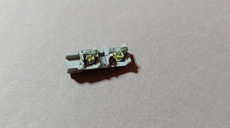 Der Bau ist eigentlich kaum der Rede wert. Zunächst setzte ich das Cockpit zusammen und lackierte es; Sitze, Steuerknüppel und Instrumententafeln lagen separat bei. Das Ganze wurde in einem hellen Grau lackiert. Anschließend bemalte ich die Details und fertigte mithilfe von Masking Tape noch Gurte an, die ebenfalls bemalt wurden. Danach folgten die Abziehbilder sowie eine leichte Alterung. Damit war der Innenraum abgeschlossen und konnte verbaut werden.