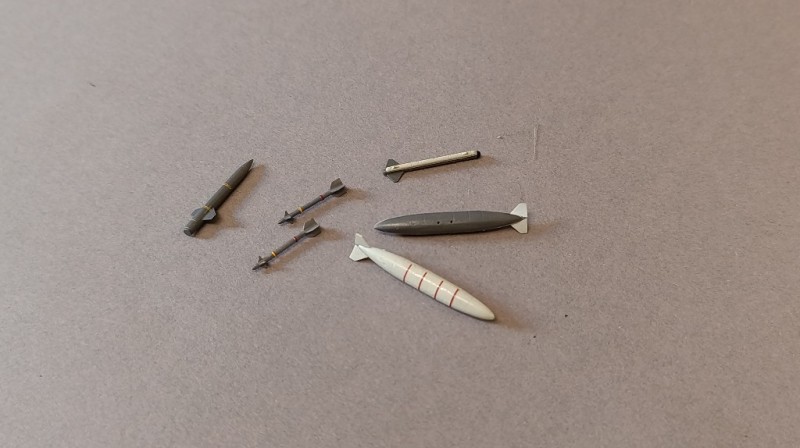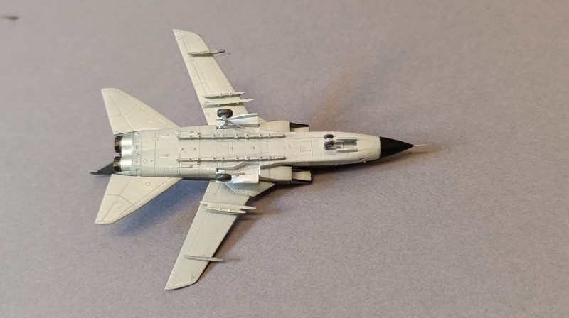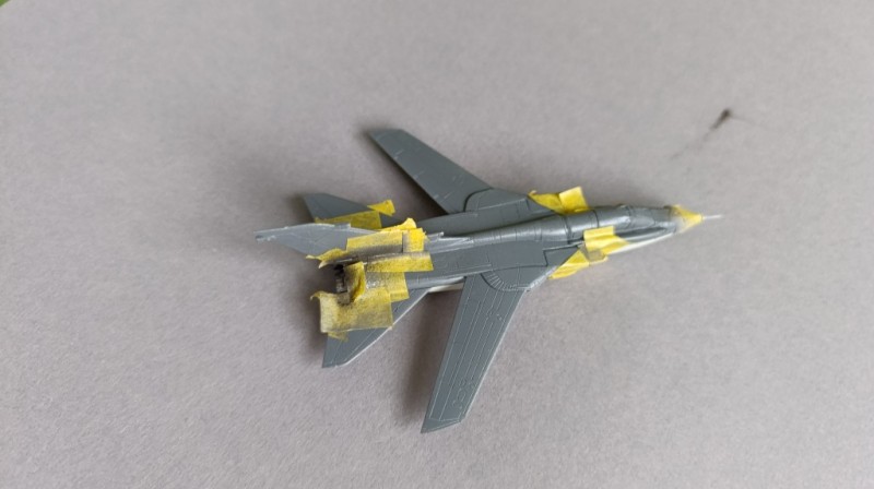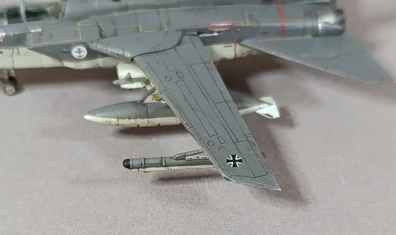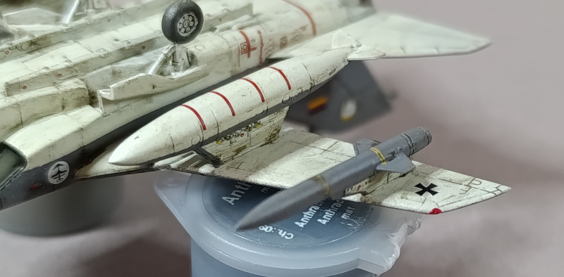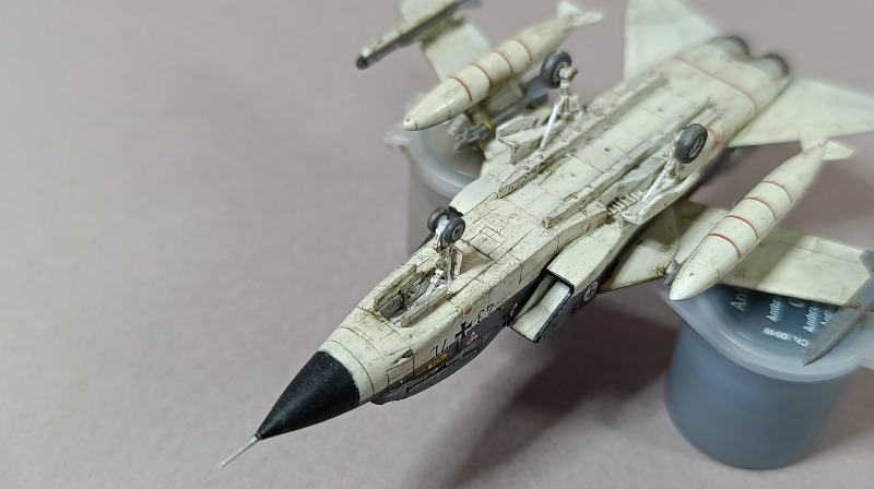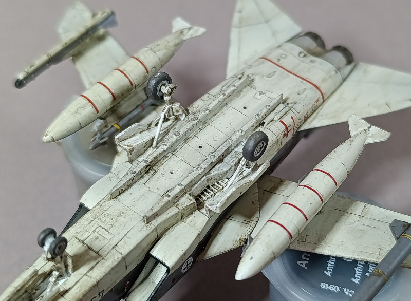 Anschließend ging es an die Lackierung. Zunächst wurde das Modell weiß grundiert, danach lackierte ich die Unterseite mit Light Ghost Grey von Ammo of Mig, die Oberseite mit Dark Grey, ebenfalls von diesem Hersteller. Auch das Triebwerk sowie die Nase wurden direkt mit der Airbrush lackiert. Ebenso erhielten die Kleinteile wie Bewaffnung, Zusatztanks, Pylone und Fahrwerk ihre Farbgebung auf diesem Weg.