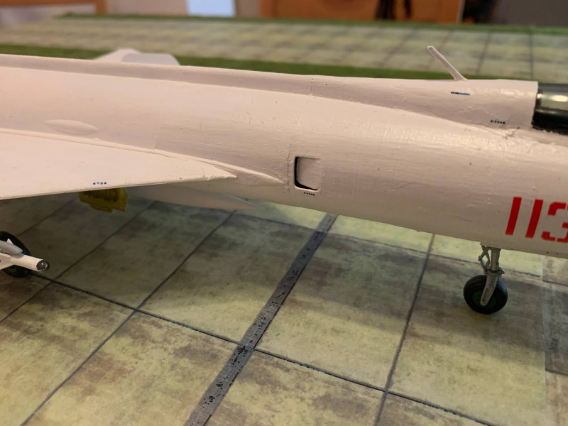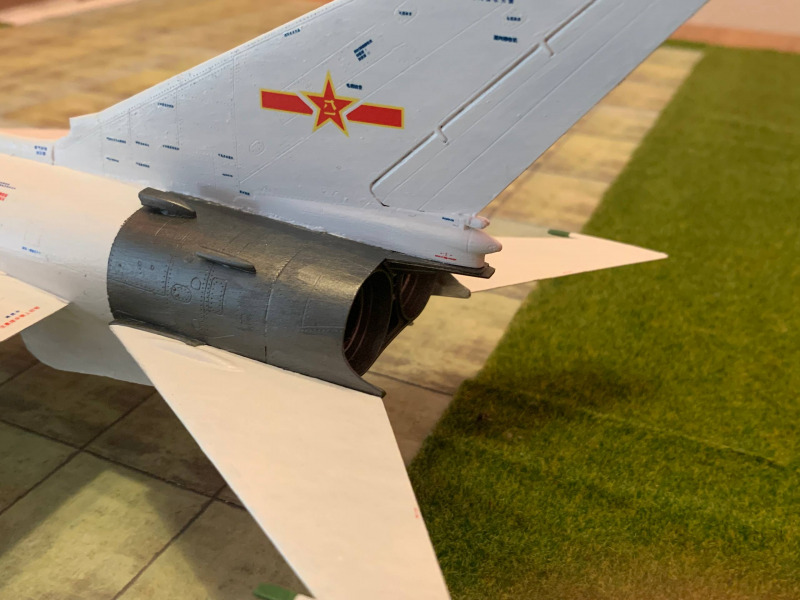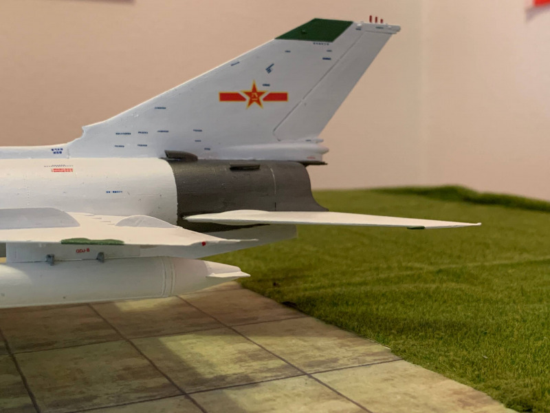 Unter den Tragflächen habe ich jeweils einen externen 480-Liter-Zusatztank sowie eine R-3S-Luft-Luft-Rakete angebracht. An der Centerline befindet sich ein zusätzlicher 490-Liter-Zusatztank, der identisch mit dem der MiG-21 ist. Dieser stammt ebenfalls aus dem bereits erwähnten J-7-Bausatz.
