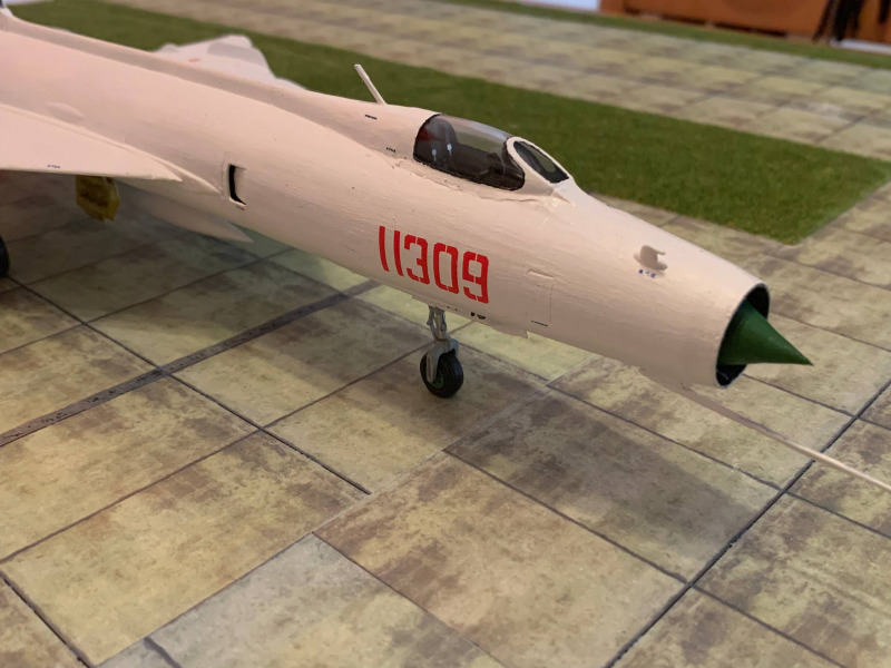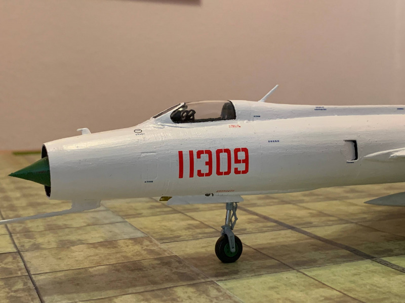 Die J-8I habe ich im für die damalige Zeit typischen Farbschema der PLAAF gestaltet: ein komplett weißer Anstrich mit grünen Details an Kegelnase, Felgen und Sensoren. Die Stencils auf dem Rumpf orientieren sich grob an deren Position auf der J-8F. Für die Tragflächen verwendete ich Stencils, die ich noch von einem J-7-Bausatz übrig hatte, und positionierte sie auf Grundlage der Anordnung beim MiG-21PF-Bausatz von Eduard. Leider sind beim Trumpeter-Bausatz keine Stencils für die Tragflächen vorgesehen. Die übrigen Decals – darunter Hoheitszeichen und Kennnummern – stammen ebenfalls aus dem J-7-Bausatz.