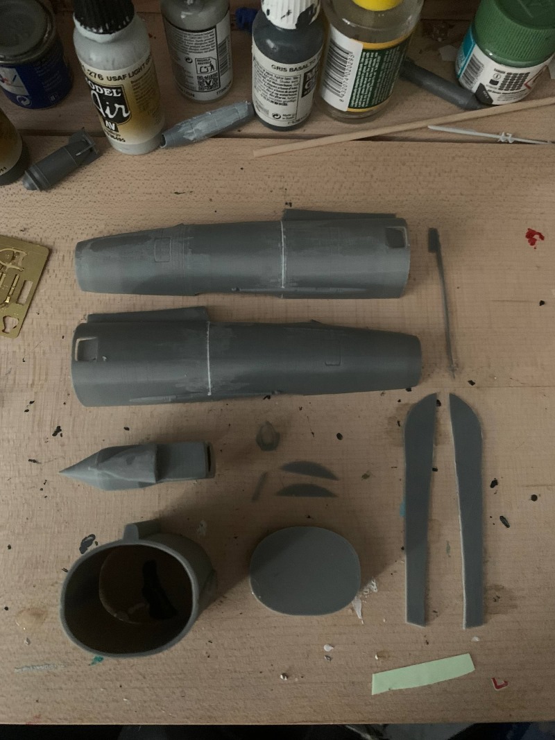 Während der Modellierung der Frontsektion musste ich an einigen Stellen improvisieren, da leider nicht genügend Zeichnungen und Referenzaufnahmen verfügbar waren. Daher orientieren sich die Kegelnase und Teile der inneren Struktur teilweise an der MiG-21MF. Leider war das Notebook, auf dem ich die J-8I konstruiert habe, nicht besonders leistungsstark. Aus diesem Grund musste ich mich bei der Detaillierung auf die wesentlichen Elemente beschränken. Nach mehreren Stunden exportierte ich schließlich das 3D-Modell, um es zu skalieren und für den 3D-Druck vorzubereiten. Bevor das endgültige Modell gedruckt wurde, fertigte ich einige Probedrucke an, um mögliche Fehler beim Modellieren zu erkennen und gegebenenfalls Anpassungen vorzunehmen. Besonders der Übergang zum vorhandenen J-8F-Rumpf sowie die Passgenauigkeit mit Cockpit und Fahrwerksschacht erforderten dabei kleinere Korrekturen. Der UmbauNachdem diese Bereiche überarbeitet worden waren, begann ich damit, die neuen Einzelteile endgültig auszudrucken und zusammenzusetzen. Die Komponenten ließen sich insgesamt gut montieren, und sowohl das Cockpit als auch der Fahrwerksschacht passten problemlos in die neue Rumpfsektion. Einige Stellen – etwa die Nahtbereiche – mussten jedoch gespachtelt und nachbearbeitet werden.