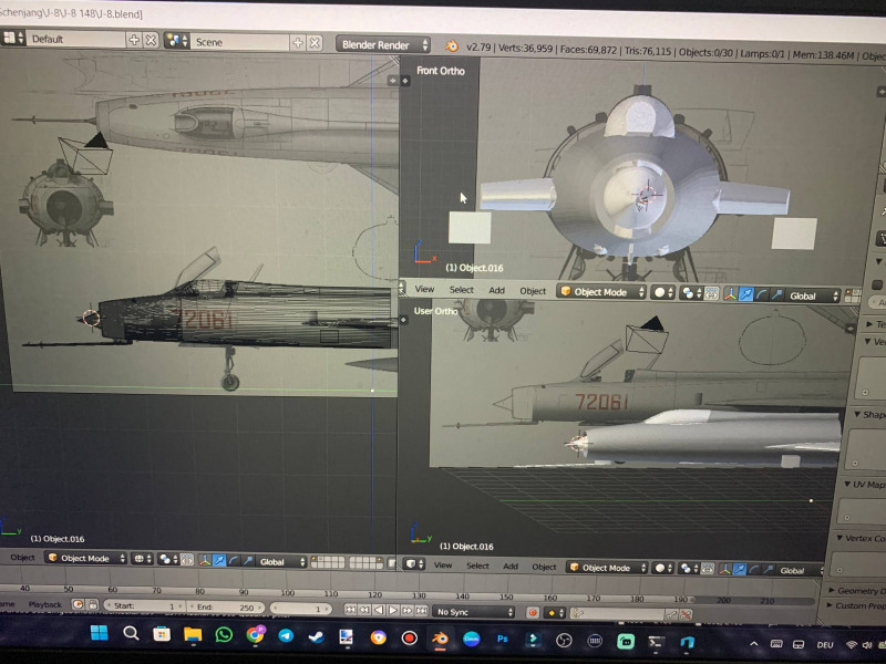 Auf Grundlage dieser Zeichnung begann ich mit der Gestaltung der vorderen Rumpfsektion der J-8I sowie der hinteren Stabilisatoren im CAD-Programm „Blender“. Parallel dazu baute ich das Cockpit und den vorderen Fahrwerksschacht zusammen, um die fertigen Elemente auszumessen und in das 3D-Modell einfließen zu lassen. Darüber hinaus nahm ich die Cockpithaube aus einem MiG-21PF-Bausatz von Eduard als Referenz, die mir noch aus einem früheren Projekt übrig geblieben war. Die übrigen Teile des J-8F-Bausatzes hatte ich zu diesem Zeitpunkt bereits vorbereitet.