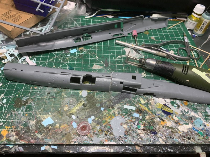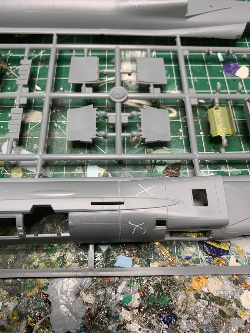 Nachdem die Zeichnungen vorbereitet waren, suchte ich zusätzlich nach Detailaufnahmen, was wiederum einige Zeit in Anspruch nahm. Letztendlich fand ich eine Art Reisebericht eines russischen Touristen, der mehrere Detailfotos der im Museum der chinesischen Luftstreitkräfte in Peking ausgestellten Maschine gemacht hatte. Nach stundenlanger Recherche begann schließlich der eigentliche Umbau. Zunächst suchte ich eine geeignete Stelle, an der ich den Rumpf des J-8F-Bausatzes von Trumpeter teilen konnte, um einen Querschnitt zu erhalten, auf dessen Basis der vordere Rumpf neu gestaltet werden sollte. Nachdem ich eine passende Position gefunden hatte, trennte ich die Rumpfteile und klebte die verbliebenen hinteren Rumpfsegmente mit Klebestreifen zusammen, um den Querschnitt abzuzeichnen. Diesen scannte ich anschließend ein und fügte ihn in die Konstruktionszeichnung ein.