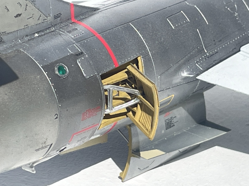 Der Bau auf Basis der RF-104-Bausatzes verlief identisch wie alle meine bisherigen Starfighter aus den Jahren 2017 und 2024, und die verwendeten Zusatzteile sind dieselben Der C2-Schleudersitz stammt genau wir die Schubdüse von Aires, ebenso das Cockpitset, das verwendet wird, um die Einrichtung etwas aufzuwerten. Weiterhin wurde entsprechend des Vorbildfotos die Triebwerk-Wartungsklappe geöffnet dargestellt, dafür hab ein Set von CMK genutzt. Hier ist auch der dann sichtbare Teil des Triebwerks enthalten. Ich hab den Piloten so eingesetzt das er ungefähr wir auf dem Vorbildfoto aussieht.