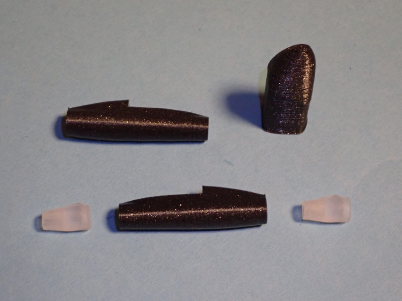 Für die Triebwerke nutzte ich die von meinem Arbeits- und Modellflugkollegen Dominik resingedruckten Impeller, die ich für meinen Turbo-Habicht ( https://www.modellversium.de/galerie/artikel.php?id=19873&fscode=23800 ) konstruiert hatte. Er hatte mir noch zwei davon als Reserve gedruckt, somit waren die dann auch gleich verwertet. Diese trennte ich in der Mitte durch und konstruierte den passenden Mittelteil der Turbinengehäuse. Die Teile entstanden mit meinem Filamentdrucker. Im vorderen Bereich wurde der Übergang zu den Lufteinlässen mit Spachtelmasse angeglichen.