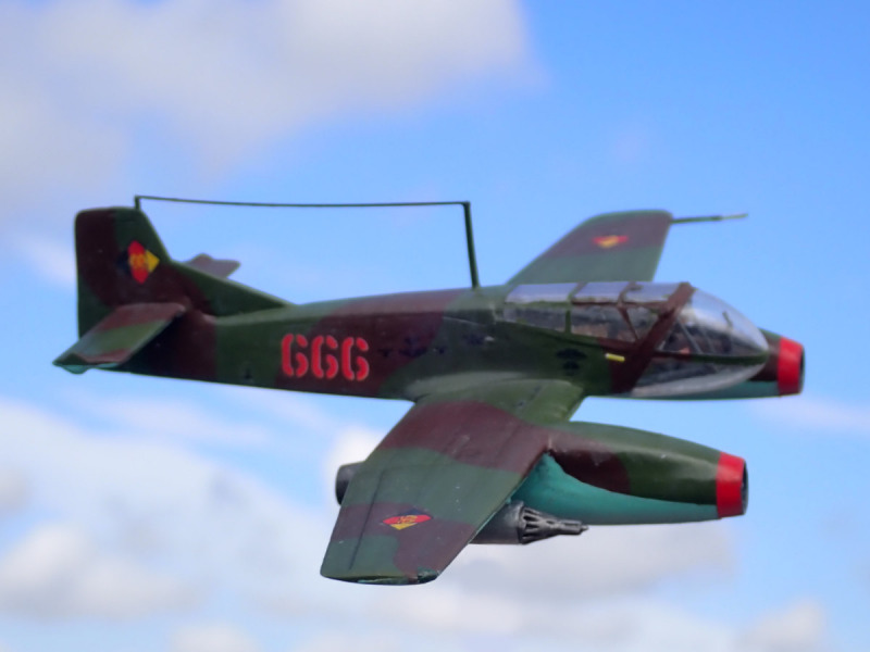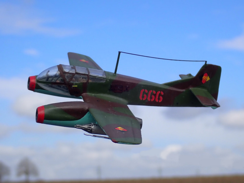Lackiert habe ich das „What if“ mit Emailfarben von Humbrol und Revell, mit dem Pinsel. Die Decals stammen aus Bausätzen von AZ (He 162 C, NVA-Markierungen) und KP (SIAI Marchetti SF-260, Wartungs- und Warnhinweise). Vor dem Anbringen der Decals versiegelte ich mit glänzenden Klarlack, danach mit seidenmattem. Dann erhielt das Modell ein leichtes Washing und die Ruderspalte wurden mit einem schwarzen Holzstift hervorgehoben. Als das trocken war, sprühte ich die fiktive B9 STW mit mattem Klarlack ein. Alle Klarlacke sind von Mr.Hobby.