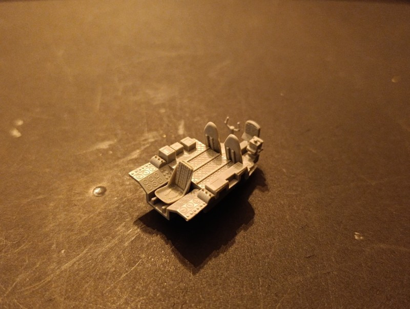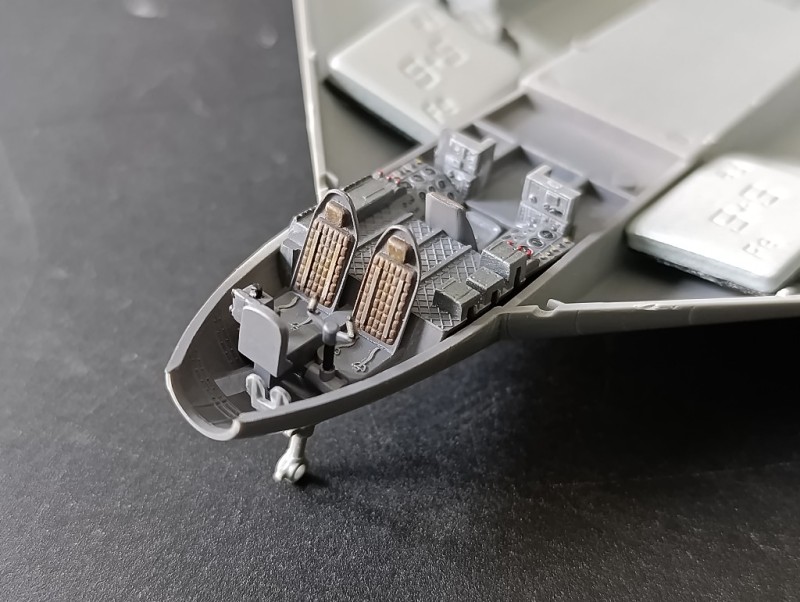 Zum BauDer Bausatz ist ja doch recht übersichtlich und im Großen und Ganzen auch sehr solide. Für ein fiktives Flugzeug ist das Modell erstaunlich gut detailliert und trotzdem recht einfach aufgebaut, so dass auch der Einsteiger diesen Bomber fertig bekommen sollte. Der Bau startete mit dem Cockpit, wie so oft. Es ist erstaunlich, dass Revell es hier geschafft hat, ein sehr realistisches Cockpit zu schaffen mit wirklich wenigen Teilen, noch dazu, weil es ja kein Vorbild gab. Ich habe dieses mit Grau lackiert und die Details mit dem Pinsel bemalt. Zur Ergänzung habe ich noch ein paar Kabel aus gezogenen Gussästen hinter das Instrumentenbrett angeracht.
