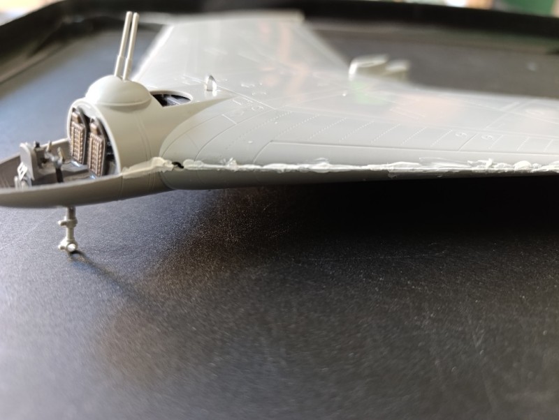 Dann ging es auch schon daran, Ober- und Unterflügel zusammen zu setzten und hier wurde es knifflig. Denn das Ganze passte fast gar nicht, es entstanden mehrere Überstände und Lücken, vermutlich waren die Bauteile auch leicht verzogen. Ich musste beide Teile zum Korrigieren mehrfach wieder voneinander lösen. Letztlich hat alles nichts geholfen und es war ordentlich Spachteln angesagt, insbesondere am Cockpit, wo ein ziemlicher Überstand entstanden ist. Der Triebwerksblock hat mich etwas ausgetrickst, denn eigentlich wollte ich erst Ober- und Unterteil zusammensetzen und dann die Ein- und Auslässe hineinschieben, doch das geht nicht, weil die Teile nicht gerade, sondern spitz zulaufend sind. Also auch hier wieder gelöst und erst die eingebaut.