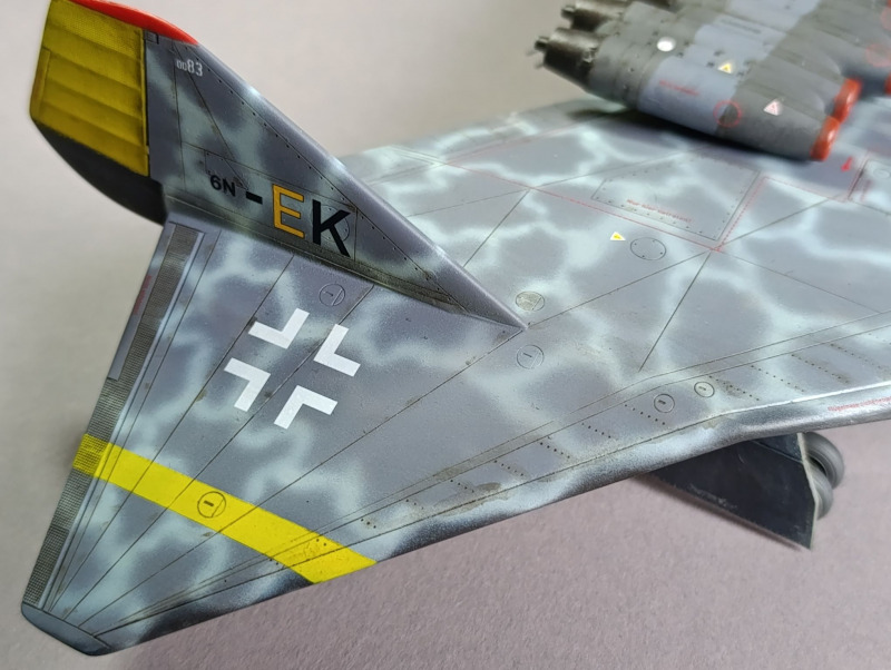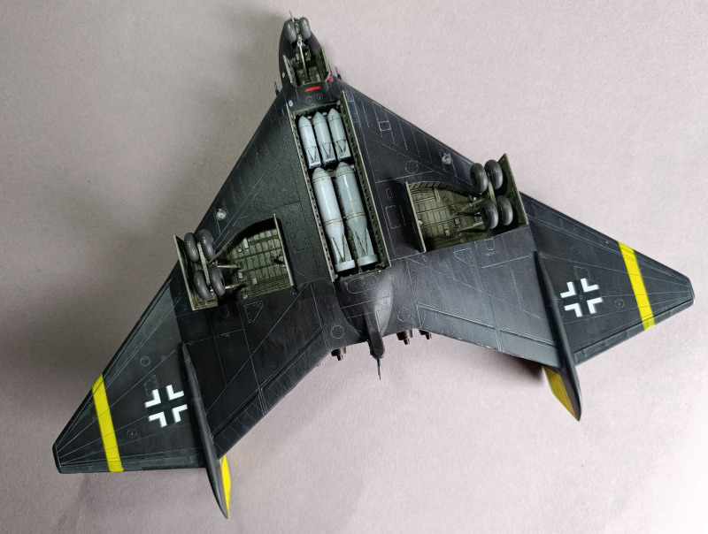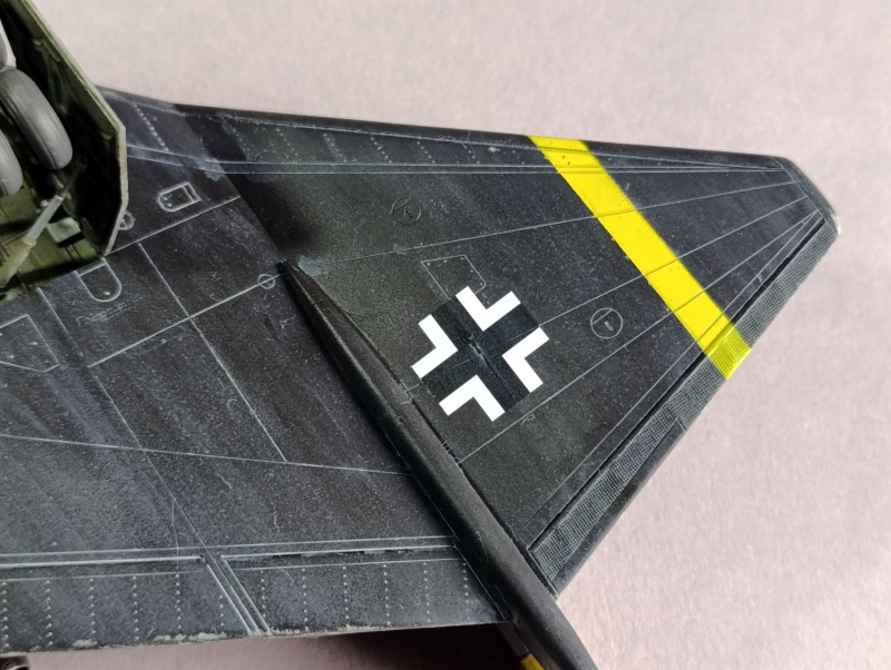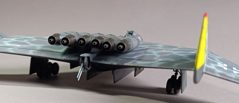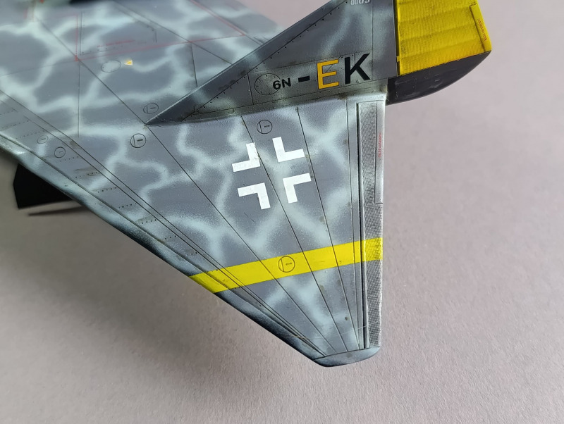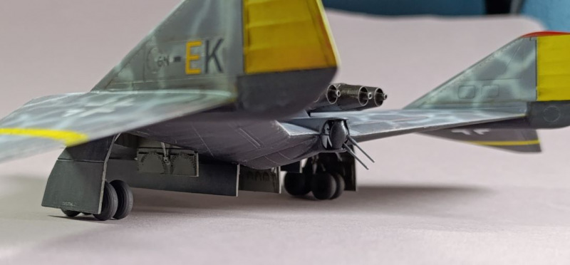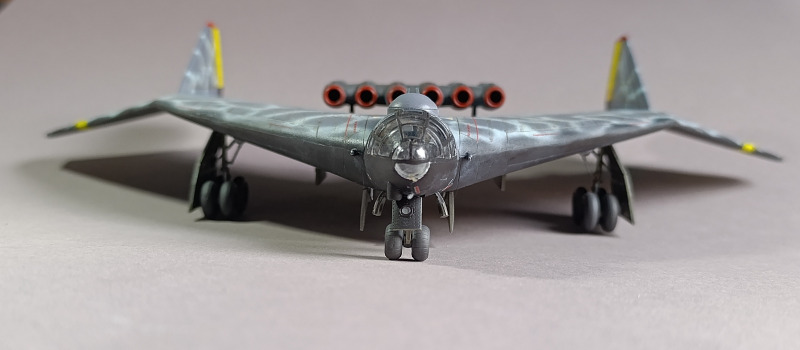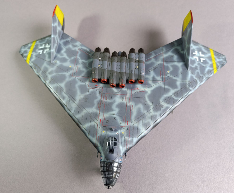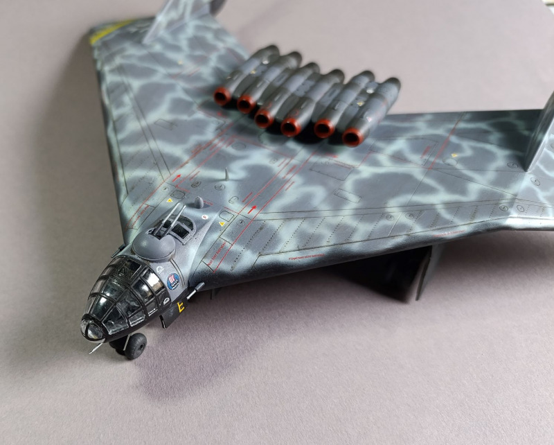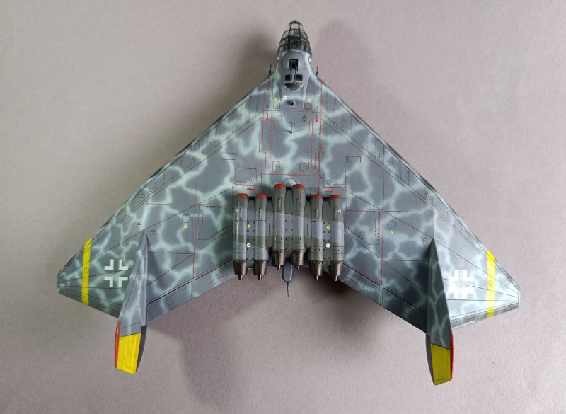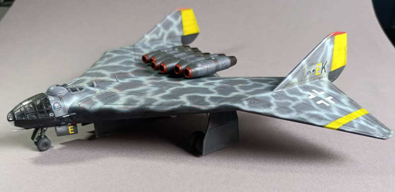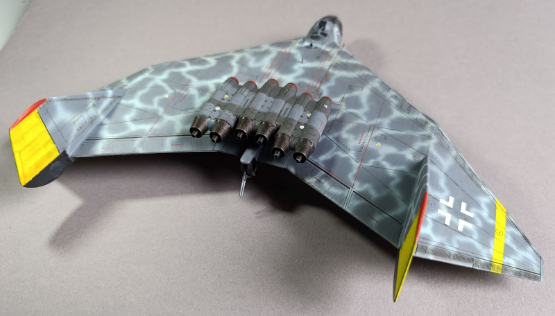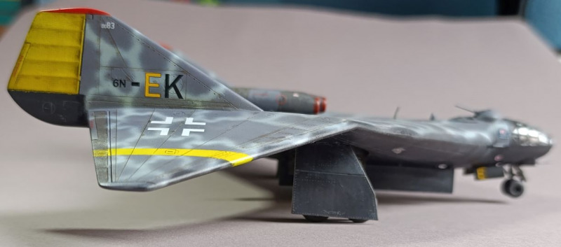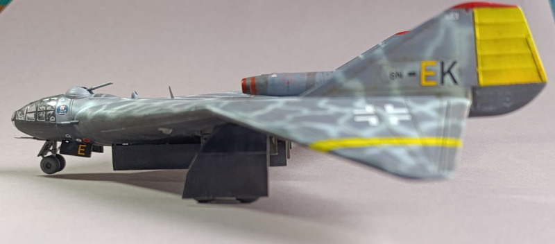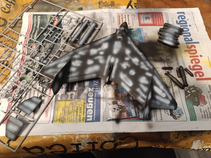Ja, und dann sind wir eigentlich auch schon mit dem Rohbau durch, weiter ging es mit der Farbgebung. Die Arado habe ich zunächst schwarz lackiert und ein Preshading mit Weiß gesetzt. Die Frage, wie soll denn die Maschine eigentlich aussehen, hat mich ebenfalls einiges an Zeit gekostet, bis ich auf YouTube ein Bauvideo gesehen habe, wo mir das Ergebnis sehr gefallen hat. Die Oberseite war mit Tarnflecken auf hellblauen Grund, die Unterseite schwarz und der Triebwerksblock mit Splittercamo. Von der Sache her entspricht es damit weitgehend dem ersten Vorschlag, bis auf die Unterseite.
