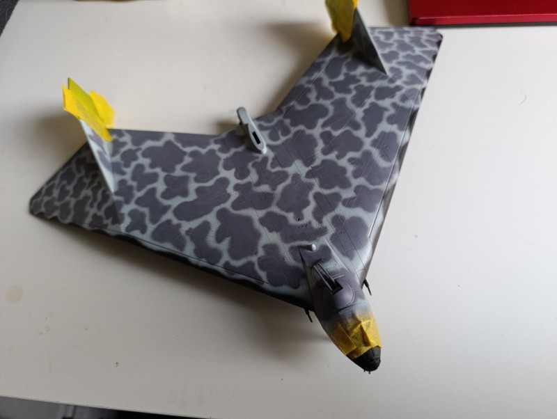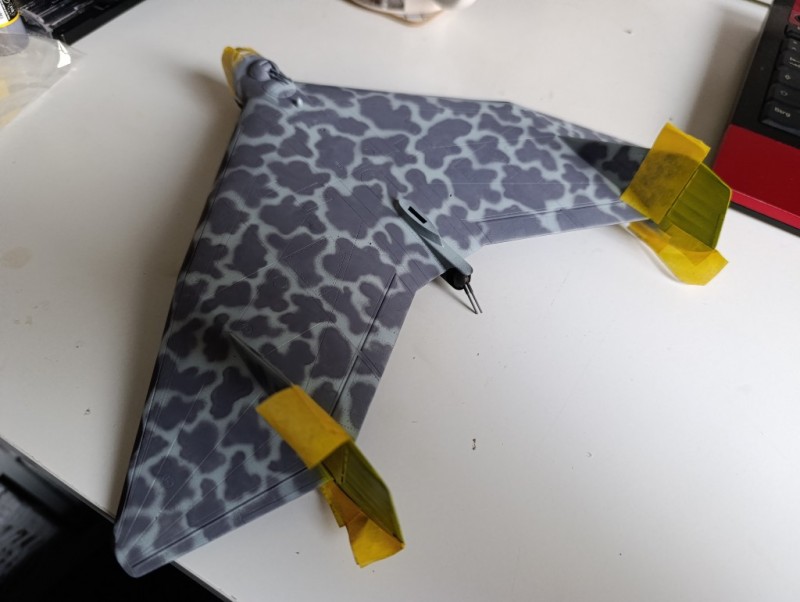 Ich habe also zunächst die Unterseite lackiert, das war noch der einfache Teil. Dann versuchte ich mich an der Oberseite, ging jedoch falsch vor, ich habe erst alles Hellblau gesprüht und dann die Tarnflecken, das Ergebnis war zwar okay, aber nicht ganz meinen Vorstellungen entsprechend. Also das Ganze nochmal runtergeschliffen und dann mit Grau komplett überlackiert. Mit einer ganz feinen Düse habe ich dann die Flecken entstehen lassen, was natürlich eine ziemliche Arbeit war - das Ergebnis jedoch hat mir gefallen.
