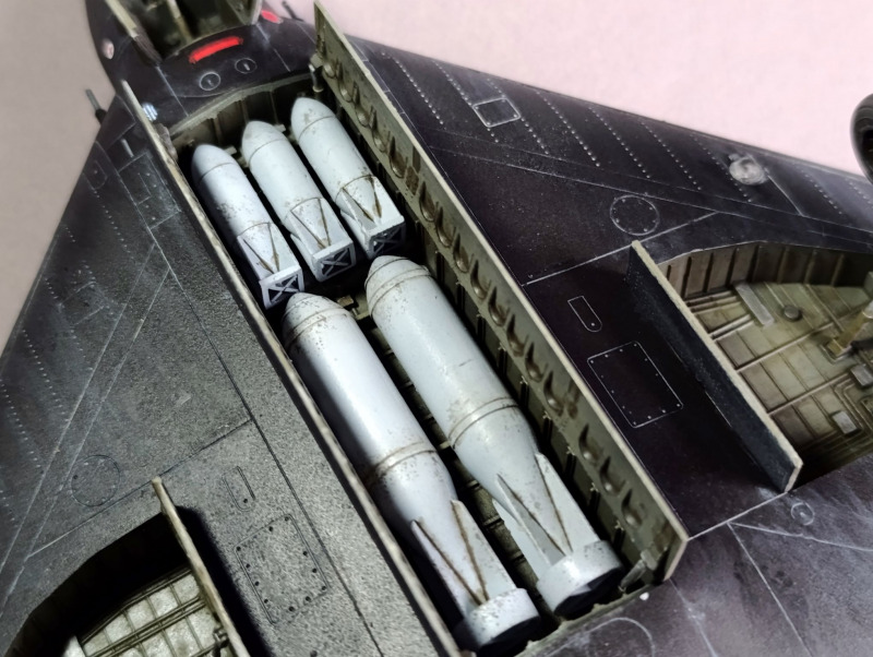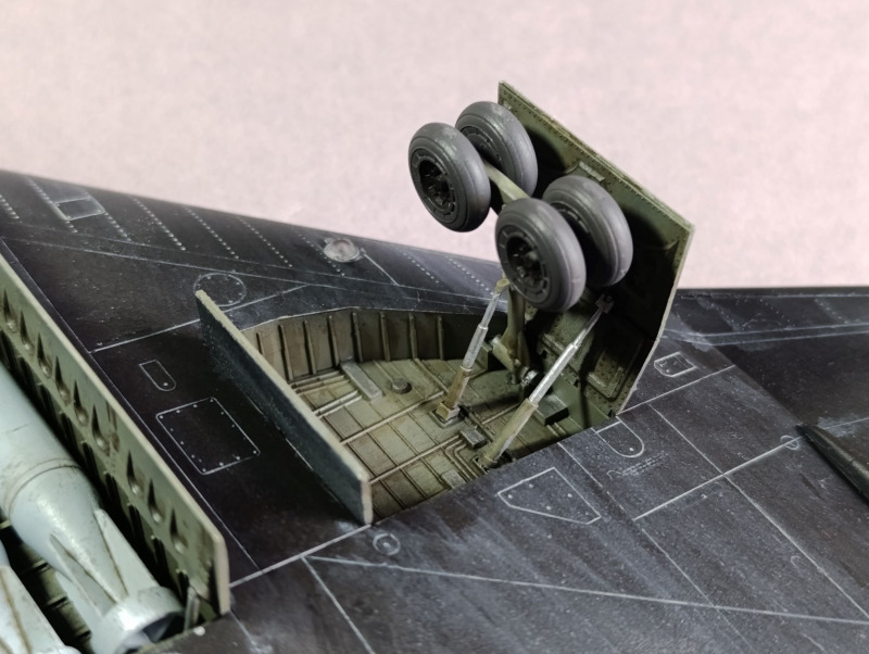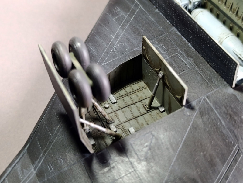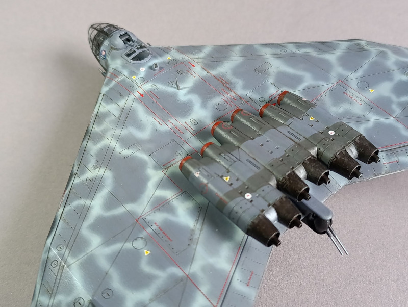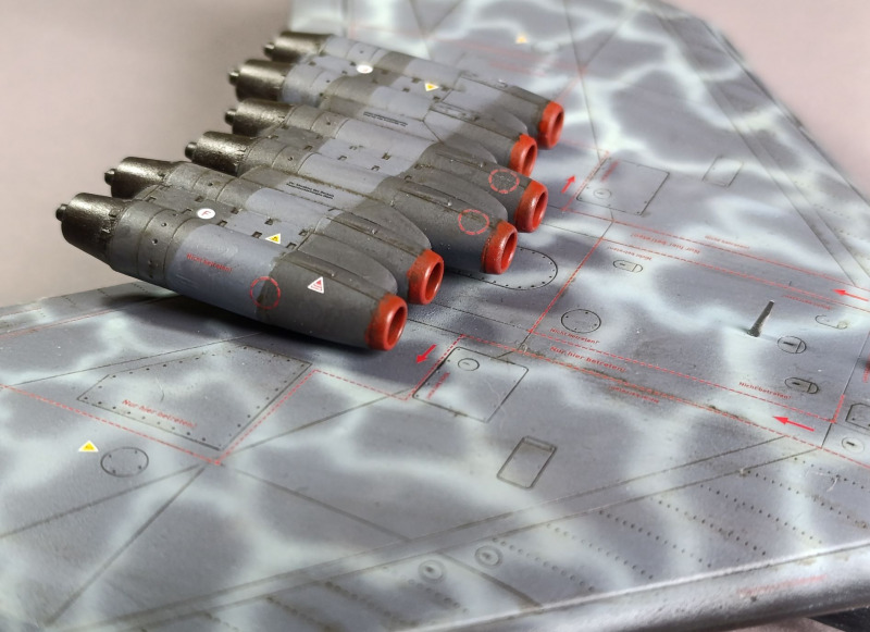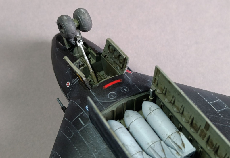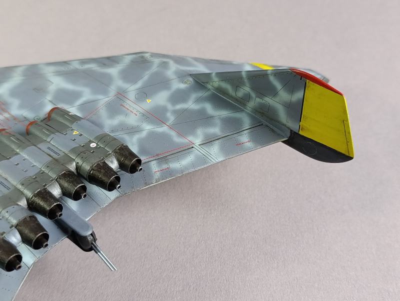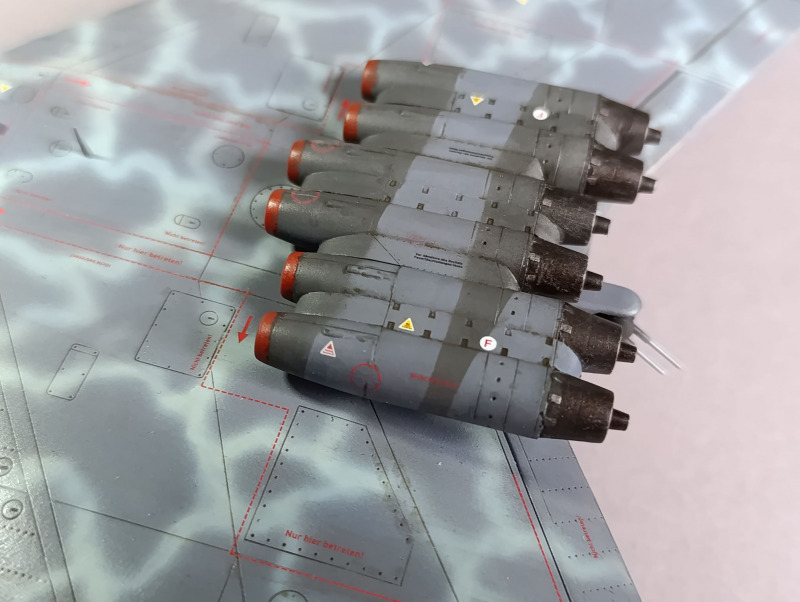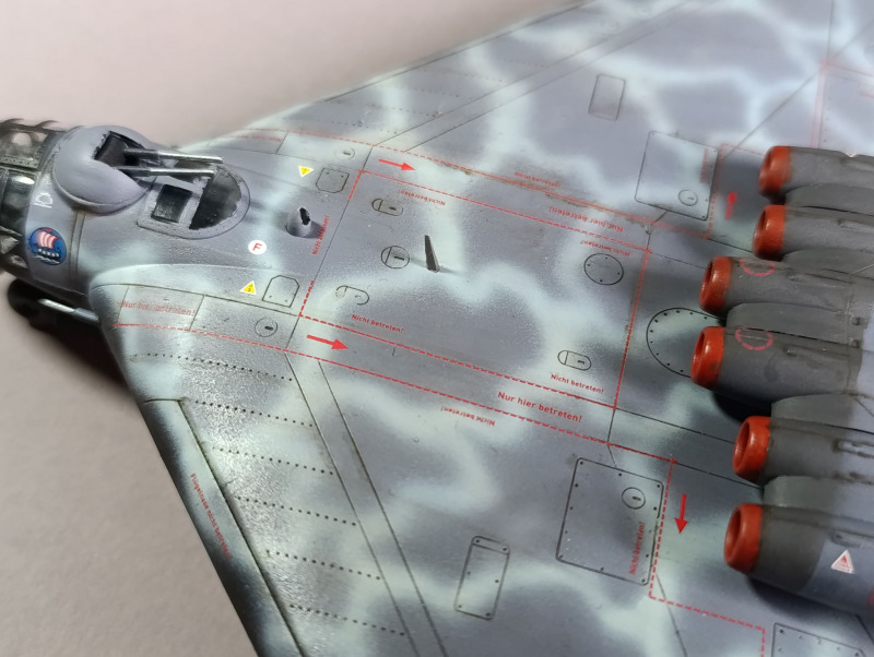Nachdem die Tarnung aufgebracht war, konnte ich das Fahrwerk anbringen und die Details bemalen. Die Bomben und die Triebwerkssektion jedoch mussten noch warten, die sollten erst ganz am Ende verbaut werden. Dinge, die mir immer wieder passieren sind, dass ich relativ oft einige Details vergesse zu bemalen, so auch dieses Mal mit dem Pitot-Rohr. Nach der Lackierung habe ich dann noch die Abziehbilder angebracht, verteilt über mehrere Tage. Da Revell hier auch umfangreiche Wartungshinweise beigelegt hat, muss man ordentlich Zeit einplanen. Das Problem ist auch, dass die schwarz-weiße Anleitung hier fehlerhaft ist und falsche Nummer angegeben sind oder Linien, die die Position der Markierung zeigen sollen, ins Nichts führen. Da die Wartungshinweise für die Unterseite ausgerechnet schwarz dargestellt sind, sieht man die natürlich nicht mehr.