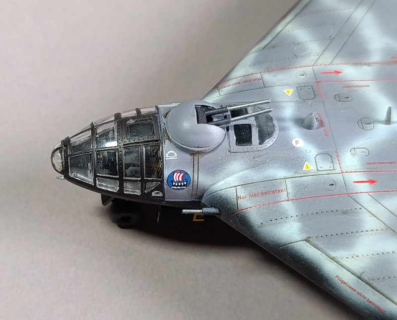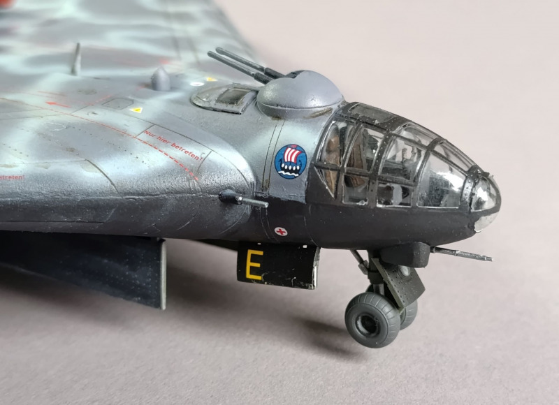 Anschließend habe ich mit Revell-Klarlack versiegelt und nach einer Trocknungsphase von 24 Stunden gealtert. Hier hielt ich mich natürlich so weit zurück, da die Arado mit Sicherheit nicht derartig belastet und verschlissen wurde. Zuletzt habe ich alles noch mit Klarlack versiegelt, die Bomben und Triebwerke angebracht und die Masken abgezogen. Damit stand ein weiteres Modell in meiner Vitrine. Zum VorbildDie Arado Ar. 555 war nur noch ein Gedankenexperiment, die Kriegslage ab 1944 erlaubte die Fertigstellung dieses Langstreckenbombers ohnehin nicht mehr, obwohl unter dieser Typenbezeichnung noch ganze 14 zum Teil recht unterschiedliche Versionen entstanden. Ob noch an einem Prototyp gewerkelt wurde, ist jedoch auch nicht mehr ganz geklärt - hier haben wir es mit dem ersten Entwurf zu tun. Die für dieses Flugzeug ausgerechnete Reichweite hätte jedoch nicht bis New York gereicht, so dass die Maschine etwa 100 km vor der US-Westküste hätte abdrehen müssen. Das Flugzeug hier wird hier in der 2. Staffel des Kampfgeschwaders 100 dargestellt. Letzter Kommandeur dieser Einheit war Hauptmann Hans Molly. Was hier etwas widersprüchlich ist, ist dass diese Einheit eigentlich auf die Bekämpfung von Schiffszielen spezialisiert war. Natürlich ist es auch vorstellbar, dass die Arado hierzu hätte genutzt werden können oder spezielle Angriffe auf Häfen durchgeführt worden wären, vielleicht hätte man aber auch mit der Umschulung auf diesen Flugzeugtyp das Einsatzspektrum der Staffel verändert. Wie dem auch sei, handelt es sich ohnehin nur um reine Spekulationen.