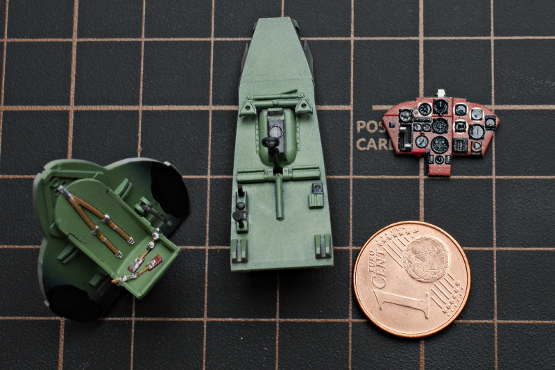 Für mein Modell benutzte ich das zur Verfügung stehende Zubehör, ergänzt habe ich die Bremsleitungen und das bruchgefähdete Pitotrohr des Bausatzes durch Metall ersetzt. Der Bausatz berücksichtigt verschiedene Rüststände mit optionalen Teilen wie Kabinenhauben, Schubdüsen und zusätzlichen Seitenrudern. Eigentlich wollte ich das Triebwerk im offenen Rumpf zeigen, aber irgendwie fehlten mir zu viele Teile, denn bisher ist nur die Starter-Edition und im Gegensatz zu 1:72 (noch?) nicht die Expert-Edition erschienen. So ist das 3D-gedruckte Triebwerk daneben gelandet - der Ständer war Teil des Triebwerksbausatzes, sogar als Spritzguss!