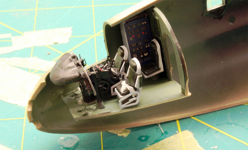 Das Innere des Rumpfes bleibt ohne jedes Detail - was mich persönlich nicht stört - dafür sind manche Cockpitdetails recht brauchbar vorbereitet. Das macht auch durchaus Sinn, verspricht doch die großzügige Verglasung einen guten Einblick. Um hier die Dichte der Details zu erhöhen, habe ich zusätzlich noch das Cockpit-Set von Eduard verbaut, was ich als eine durchaus empfehlenswerte Investition empfehlen möchte. Einzelne Teile wie die Zündverkabelung, Hydraulikleitungen, Antennenanlagen oder Auspuffrohre die habe ich gescratcht.