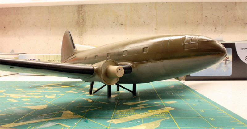 Die Passgenauigkeit dieses Kunststoffs ist dabei gar nicht einmal so schlecht, gröbere Unstimmigkeiten sind mir nicht in Erinnerung. Besonders erfreut war ich über die exzellente Passung der Klarsichtteile der Rumpffenster. Diese können schön bündig mit der Außenhaut verklebt werden, ein Umstand, den ich etwa bei der Boeing 307 Stratoliner von Bat Project als nur schwer und aufwändig umzusetzen gefunden habe. Einmal fertig gestellt, resultiert der Rohbau in einem stabilen, festen Gefüge, was angesichts der Größe der Gesamtkonstruktion durchaus angenehm ist. Die kompakten abgerundeten Formen, die man zu diesem Zeitpunkt in Händen hält, machen den zeitgenössischen Beinamen „whale“ leicht nachvollziehbar.