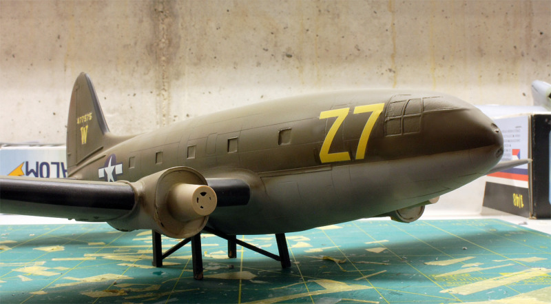 In Europa sollte die C-46 nur einmal in großer Stückzahl verwendet werden: im Zuge von „Operation Varsity“ im März 1945 lieferte die Commando an der Seite ihrer bekannteren Schwester C-47 Fallschirmjäger und Luftlandetruppen, die einen Brückenkopf östlich des Rheins etablieren sollten. Der verlustreiche Verlauf der Rheinüberquerung, bei der 19 von 72 eingesetzten C-46 verloren gehen sollten, sorgte in Europa für einen derart schlechten Ruf der großen Curtiss, dass man hier von weiteren Einsätzen absah. Ein Grund für das desaströse Abschneiden ist sicherlich auch in der Tatsache zu finden, dass die C-46 im Unterschied zur C-47 nie mit selbstdichtenden Tanks ausgestattet wurde. Das hier vorgestellte Modell zeigt eine bei „Operation Varsity“ eingesetzten C-46D Commando, die von der 313th Troop Carrier Group geflogen worden ist.