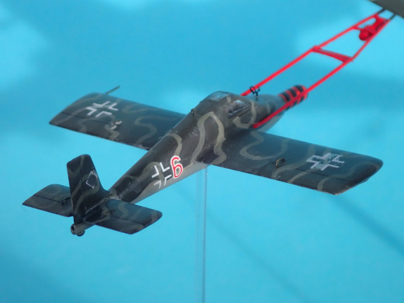 Mit seinen fast 27 cm Spannweite im Maßstab 1:72 ist das schon ein fetter Brocken. Mir kam die Idee, den Höhenjäger als Schleppmaschine für zwei Zeppelin-Rammer zu verwenden. Der Bausatz von Brengun, welcher zwei Modelle beinhaltet, lag schon seit geraumer Zeit herum. Die Entwicklung des Rammers kam nicht weit. Das Projekt erhielt nicht einmal eine eigene Nummer. Vorgesehen war es, den Rammer von einem Jäger auf Höhe zu schleppen. In der Nähe feindlicher Bomberverbände sollte dieser dann ausklinken und mit seinem Raketenantrieb (Schmidding 533) Fahrt aufbauen. In einem ersten Angriff sollten seine 14 Raketen (R4M Orkan) auf einen gegnerischen Bomber abgefeuert werden. In einem zweiten Anflug sollte ein weiterer Bomber gerammt werden. Die Tragflächen sollten zu diesem Zweck entsprechend stark ausgelegt sein. Die Landung hätte danach auf einer ausfahrbaren Kufe erfolgen sollen. Es war nicht vorgesehen, dass der Pilot nach dem Rammstoß mit dem Fallschirm aussteigt.