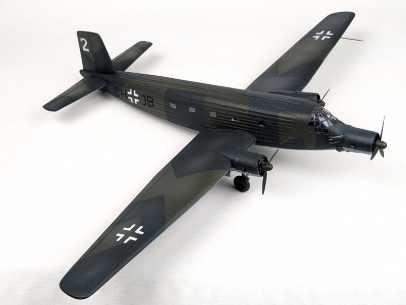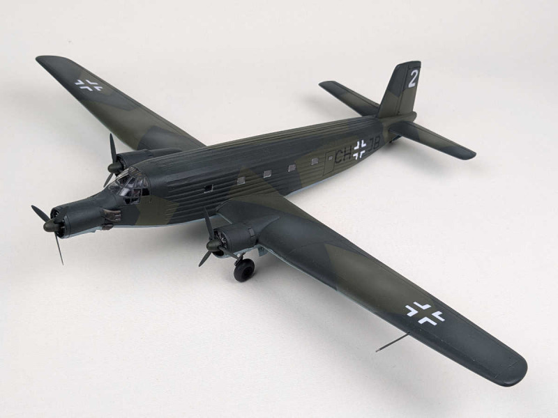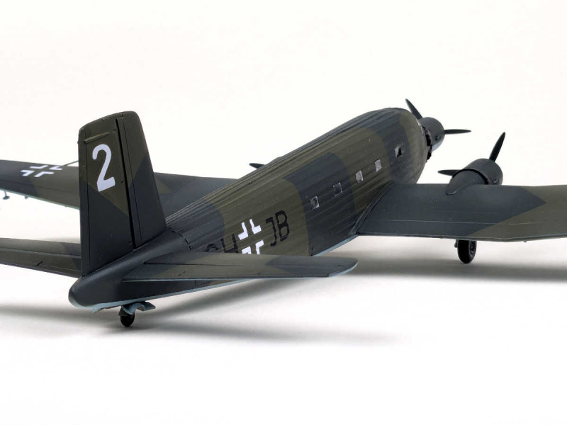 Die Junkers Ju 352 entstand als Nachfolger der Junkers Ju 252, die wiederum die Nachfolge der Junkers Ju 52 antreten sollte. Aber dieses Projekt wurde nicht weiter verfolgt. Bei der Ju 352 wurde auf verfügbarere Materialien zurückgegriffen. So bestand der Großteil des Rumpfes aus einem mit Leinwand bespannten Gittergerüst. Der erste Prototyp flog am 18. August 1943. Insgesamt sollen 19 V-Maschinen und 26 Serienflugzeuge bis August 1944 gebaut worden sein. Mein Modell soll den zweiten Prototyp Junkers Ju 352 V2 CH+JB, WNr. 352 10002, darstellen. Besonders auffällig im Gegensatz zur A-Version ist der fehlende Abwehrstand hinter dem Cockpit. Der zweite Prototyp flog erstmals am 8. November 1943. Nach zahlreichen Erprobungen bei Junkers kam sie im Dezember nach Rechlin. Dort erfolgten neben der Mustererprobung auch zahlreiche Transportflüge. Mindestens bis Mitte 1944 verblieb das Flugzeug in Rechlin. Danach kehrte sie zu Junkers zurück, wo sie noch im Februar 1945 nachweisbar war.