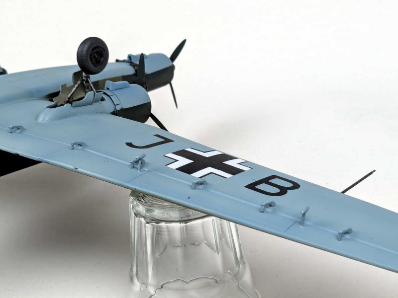 Der Bausatz von MACH2 ist sehr zwiespältig. Während die Passgenauigkeit relativ gut ist, sind die Details sehr grob und teilweise falsch. Die Oberfläche das verwendeten Plastiks ist recht rau. Die Rumpfstruktur der Leinwandbespannung ist nicht vorhanden, obwohl sie auf allen Fotos des Flugzeuges deutlich sichtbar ist. Ich habe versucht, diese Struktur darzustellen. Die Motorenverkleidung sind zu kurz und wurden entsprechend verlängert. Am Fahrwerk fehlt eine Verstrebung, die ergänzt werden muss. Das "Beste" war aber, dass der Spritzrahmen der Klarsichtteile ein Fenster zu wenig beinhaltet - also muss man ein Fenster selbst verschließen. Weiterhin ist das Cockpit falsch dargestellt. Die Trennwand zum Frachtraum ist weiter hinten als von MACH2 vorgesehen. Außerdem fehlen der Arbeitsplatz des Bordfunkers und der Platz für den Bordmechaniker. Auch die Verkleidung hinter den Sitzen von Pilot und Copilot sucht man vergeblich. Ein Fahrwerksbein muss zerschnitten und gedreht werden. Die Motoren und die Propeller wurden durch Teile aus dem Fundus ersetzt. Bemalt wurde mit Vallejo Farben, alle Kennungen wurden gespritzt, Decals fanden keine Verwendung.