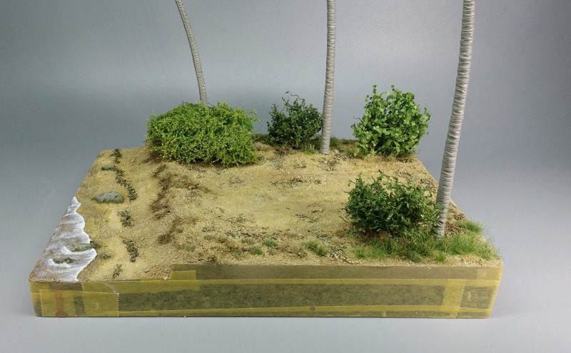 Schon vor Beginn der Arbeiten am Ka-tsu war mir klar, dass das später fertige Modell sein Zuhause in einer typischen Strandlandschaft des Pazifik finden sollte. Dabei sollte nicht unerwähnt bleiben, dass die von mir dargestellte Szenerie absolut fiktiv ist. Wie schon in der Historie erwähnt, sollte der eigentliche Einsatz von U-Booten erfolgen. Für mich übte aber die Darstellung eines Ka-tsus auf einen U-Boot-Rumpf überhaupt keinen Reiz aus. Gerade auch mit der speziellen Tarnung bot sich eine Strand-Szenerie einfach zu sehr an, bei der das Ka-tsu im Schatten und Schutz der Palmen auf einen Angriff auf die alliierte Landungsflotte vorbereitet wird. Das waren nun meine Bilder im Kopf, die „nur noch“ in die Tat umgesetzt werden mussten.