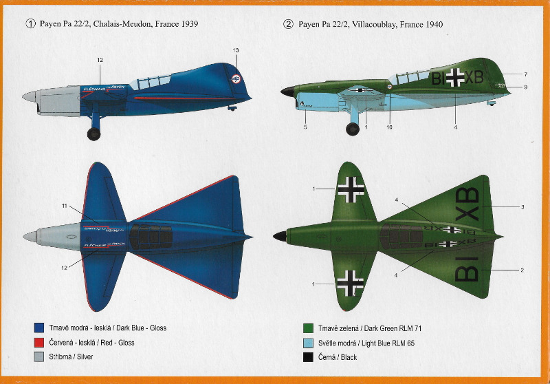 Besprechung:Das Original1935 begann Nicolas Roland Payen mit der Konstruktion eines Flugzeuges mit Tandemflügeln (Paynen Pa 22/1R). Es sollte mit einem Staustrahltriebwerk ausgerüstet werden, welches von H. F. Malot konstruiert wurde. Damit wollte er im Jahr 1939 am Flugzeug-Rennwettbewerb „Deutsch de la Meurthe" teilnehmen. Jedoch stellte sich heraus, dass das Triebwerk ungeeignet war. Außerdem fand dieser Wettbewerb nach 1936 nicht mehr statt. In Eigenregie versuchte Payen ein ausreichend starkes Triebwerk zu bekommen, was jedoch ohne Erfolg blieb. Auch hatte zunächst die französische Führung kein Interesse an dem Flugzeug. Das änderte sich aber kurz vor Ausbruch des Zweiten Weltkrieges und so war es kein Problem, den gewünschten Motor zu bekommen, für den Payen zuvor noch eine Absage kassiert hatte. Er baute sein motorloses Flugzeug deshalb um und montierte einen 180 PS staren, luftgekühlten, Sechszylindermotor vom Typ Regnier 6B-01 und nannte das neue Flugzeuge Payen Pa 22/2 „Fléchair". Es wurde nach Chalais-Meudon (Paris) gebracht, um dort im Windkanal getestet zu werden. Einen Tag später brach jedoch der Zweite Weltkrieg aus und die Pa 22/2 musste den Windkanal räumen, weil dort eine im spanischen Bürgerkrieg erbeute Bf 109 untersucht werden sollte. Die Payen-Maschine wurde eingelagert und dort Mitte Juni 1941 von deutschen Truppen beschlagnahmt. Die Geschichte der Payen Pa 22 geht noch weiter. Aber das gehört bereits zur nächsten Bausatzvorstellung ...