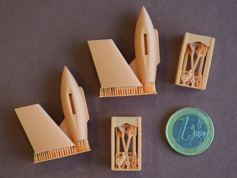 Jede Rakete besteht aus drei Teilen: dem Rumpf und zwei Flügeln. An den Flügeln müssen die Stützen der Verbindungsstellen entfernt werden, während sich am Rumpf Supportstrukturen am Triebwerk befinden. Mit einem Skalpell lassen sich die Angüsse schnell und sauber entfernen. Ein leichtes Nachschleifen ist ebenfalls erforderlich, doch die Trennstellen sind deutlich sauberer als bei klassischen Plastikmodellen. Die wenigen Details am Triebwerk und den Flügeln sind gut ausgearbeitet und wirken überzeugend. Die Flügel lassen sich problemlos in den Rumpf einsetzen und halten fest, ohne sichtbare Spalten. Die feine Schichtung des 3D-Drucks ist zwar leicht spürbar, ob jedoch eine zusätzliche Nachbearbeitung nötig ist, wird sich nach der Grundierung zeigen.
