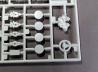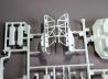 Der Innenraum besteht aus einer Wanne, in die Sitze und Armaturen eingebaut werden. Die Oberflächenstruktur wurde dabei gut getroffen. Allerdings gibt es wieder reichlich Auswerfermarken und Trennnähte – besonders am Lenkrad, wo massig Flash entfernt werden muss. Die kleinen Knöpfe auf dem Armaturenbrett werden durch Abziehbilder dargestellt. Auch der Dachhimmel, der einfach die Innenseite der Karosserie bildet, weist einige Auswerfermarken auf, die vor dem Lackieren beseitigt werden sollten. Die Karosserie selbst ist leider zweiteilig, wobei der obere Teil einteilig ist und der untere Teil unterhalb der Türen an der Bodengruppe angegossen wurde. Das erschwert das Lackieren und Bauen dieser Teile eher, als es zu vereinfachen. Leider ist auch am Unterteil eine später noch sichtbare Copyright-Aufprägung, die entfernt werden sollte. Ansonsten ist die Form gut wiedergegeben, und störende Trennnähte kann ich bei meinem Exemplar nicht finden – was jedoch bei anderen Bausätzen scheinbar nicht immer der Fall ist. Der Kofferraum vorne ist ebenfalls mit angegossen und enthält ein Ersatzrad. Es wäre jedoch besser gewesen, das Rad separat beizulegen. Abgerundet wird das Ganze mit Seitenspiegeln sowie der Motor- und Kofferraumklappe.