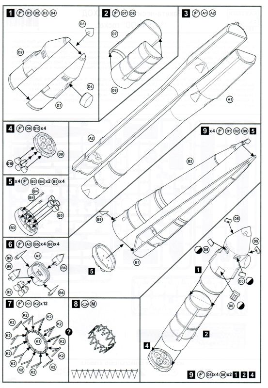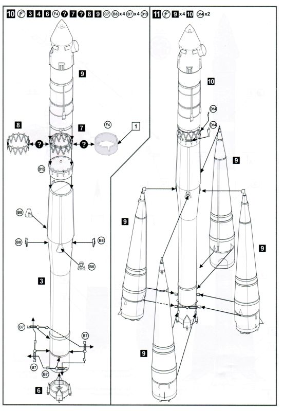 Der Bau des Modells erfolgt in insgesamt 10 Baustufen, die keine Fragen offenlassen. Der Bau beginnt mit den Raketenstufen drei und zwei, gefolgt von den vier Booster-Raketen. In Baustufe neun muss entschieden werden, welche Variante des Verbindungsrings zu Anwendung kommen soll: entweder klassisch als Kunsttoffteile oder als PE-Teil oder als transparenter Ring in Verbindung mit dem entsprechenden Decal. Alle Teile sind in einem hellgrauem Plaste ähnlich wie bei Zvezda hergestellt worden. Die Qualität überzeugt durchaus, so findet man an so gut wie keinen Stellen Grat oder dergleichen. Auch die Schubdüsen sind ordentlich ausgeformt und gespritzt. Alle Details wie versenkte Gravuren oder erhabene Stellen sind scharf und deutlich. Als Bemalungsvorschlag liefert Eastern Express die typische weiß-grau Bemalung der Wostok-Raketen. Ergänzt werden diese von verschiedenen Metalltönen. Leider nennt uns Eastern Express keine konkreten Farbhersteller, sodass man sich bspw. bei Zvezda’s Sojus-Bausatz orientieren sollte.