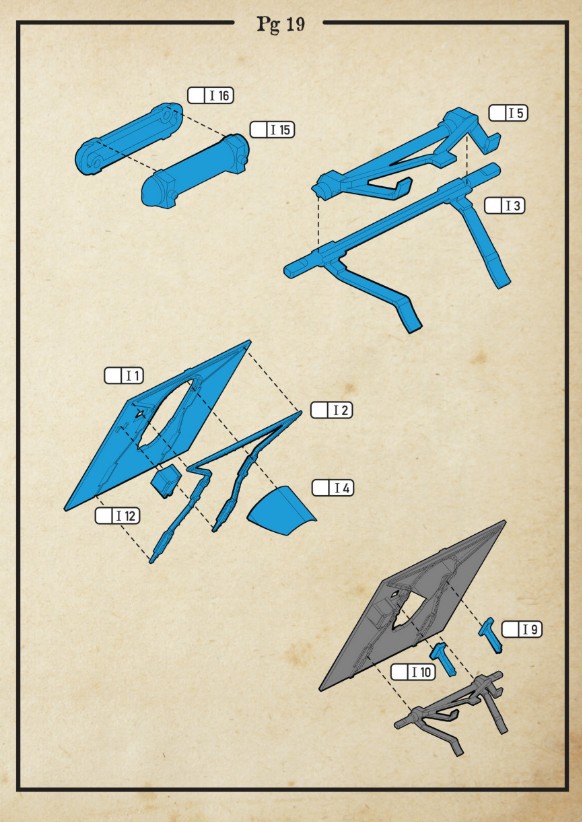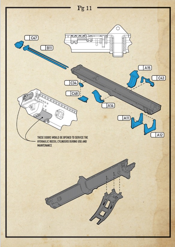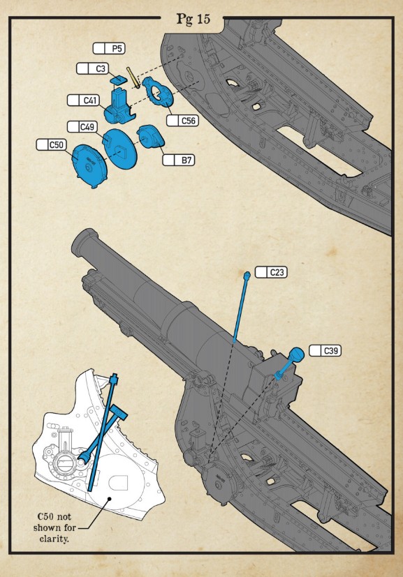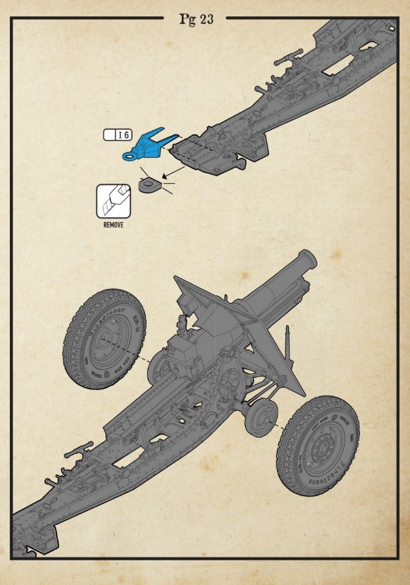 Der BauplanDas 24seitige Heft im typischen Retrostil von „Das Werk“ mit der Anmutung eines gebrauchten „field manuals“ führt auf 17 Seiten zum fertigen Modell. Dabei wird deutlich, dass die Macher sich an Erfahrungen und Wünschen von Modellbauern orientieren. Zusammenzusetzende bzw. anzubauende Teile sind blau gedruckt, bereits Montiertes in einem dunklen Grau. Eine jeweils überschaubare Anzahl der Teile und eine fast immer klare Aufteilung, sorgen für sehr gute Übersichtlichkeit, wenn man von Seite 14 absieht, wo es etwas enger zugeht. Seitenansichten an möglicherweise problematischen Stellen geben zusätzlich Hilfestellung. Auf neuralgische Punkte verweist ein besonderes Icon, von denen acht Stück den Modellbauer durch den Bauprozess führen. Die vorangestellten obligatorischen Texte und zusätzliche Hinweise sind auf Englisch, was im Zeitalter von KI kein Problem darstellen dürfte. Man könnte aber auch auf die Idee kommen, in Gegenrichtung zu denken bzw. zu übersetzen. Schön sind die Grafiken der M1917 und M1918 sowie ein Einsatzphoto von 1943 – für Dioramenbauer durchaus eine gefällige Anregung. Ein nützliches Detail am Rande ist die jeweils bei der Teilenummer abgedruckte Checkbox, in der man Erledigtes abstreicht. Farbangaben erfolgen zu sechs Herstellern, die Tarnmuster sind in Farbdarstellungen abgebildet. Alles ist vorbildlich gelöst – mehr geht eigentlich nicht – und macht Vorfreude auf den Bau. Ein Wermutströpfchen: das Anbringen der Teile C32/C51 (gezogene Variante) und C52/C53 (in Feuerstellung) ist unklar, da die unterbrochene Linie, die den Anbau zuordnet, durch die darüber gedruckte Lafette großteils verdeckt ist. Leider sind auf S. 14 auch noch zwei Buchstaben vertauscht: in der Querschnittszeichnung ist das mit H1 bezeichnete Teil tatsächlich das Teil G1 (obere Abdeckung des Lafettenkastens).