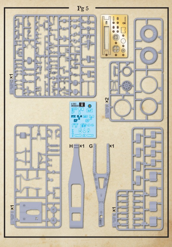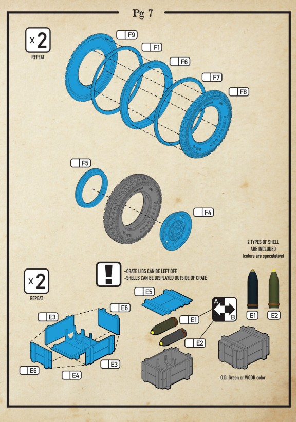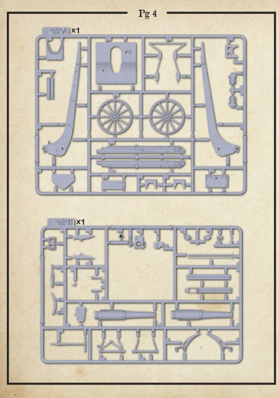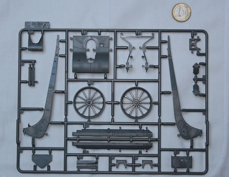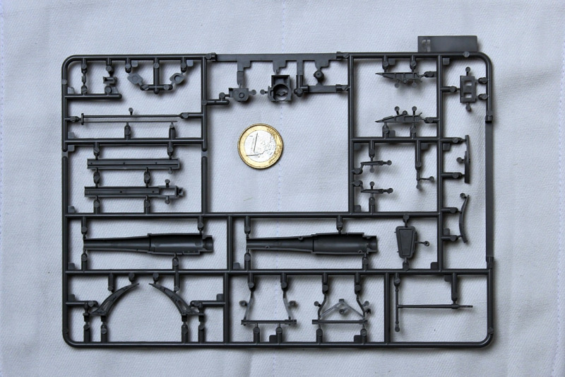 Die BauteileDie Kunststoffteile sind für mich in herausragender Qualität und beeindruckender Detailtreue mit einem zeitgemäßen Verfahren (Slide Mould) gefertigt. Verwiesen sei auf zahlreiche Nietreihen, aber auch auf die mehrteiligen Kunststoffreifen, die sogar eine Beschriftung tragen. Mit einem Schmunzeln wird man den letzten Buchstaben des Reifenherstellers entfernen. Bei einer ersten Betrachtung der Spritzlinge fällt einem sicher das zweiteilige Kanonenrohr auf, dessen kalebassenartige Form für die sonst häufig kritisierte Aufteilung verantwortlich ist. Das Werk hat aber nachträglich doch noch ein zusätzlich zu erwerbendes Drehteil (#A008) fertigen lassen, bei dem dann aber der Kopffries aufgeklebt werden muss. Letztendlich mag man darin jeweils einen Kompromiss aus technischen Möglichkeiten und Wirtschaftlichkeit/Bezahlbarkeit sehen. Die Bauteile ermöglichen die Darstellung der Haubitze im gezogenen Verband oder in Feuerstellung. Dabei ist dann in besonderer Weise beim Bau darauf zu achten, dass mehrere Teile beweglich eingebaut werden können und durch Verkleben fixiert würden, was z.B. auch Winkel und Position des Rohres anbelangt. Erfreut ist man über die Zugabe von 12 Granaten und Teilen für zwei Mun-Kisten. Wer dies zum Anlass nehmen möchte ein Diorama zu bauen, wird passende Artilleristen, wie sie zur Haubitze aus dem 1. Weltkrieg erschienen sind (Das Werk #F013), vermissen. Zumal derzeit eigentlich nur deutsche und russische Geschützmannschaften (Tamiya, Trumpeter) separat erhältlich sind.