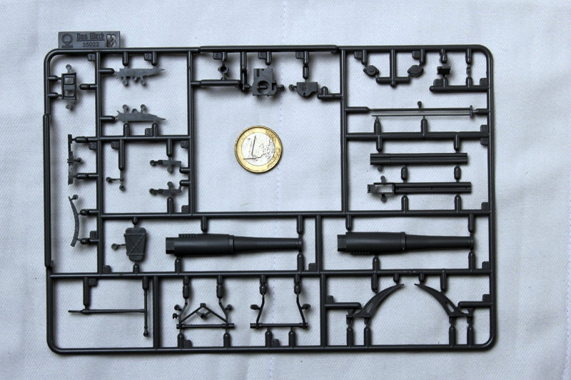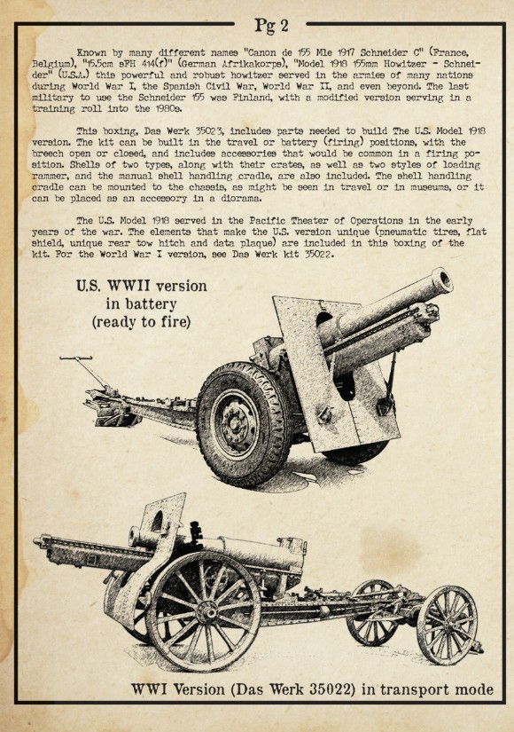 Besprechung:zum Vorbild:Ausgehend von der französischen Entwicklung der Firma Schneider in Le Creusot, die unter dem Namen Canon de 155 C modèle 1917 Schneider firmierte (Das Werk # 35022) und im Ersten Weltkrieg auch von amerikanischen Truppen eingesetzt wurde, entstand eine luftbereifte und druckluftgebremste Version des Geschützes als amerikanische Standardhaubitze zwischen den Weltkriegen, die 1942 von der Nachfolgeversion M1 abgelöst wurde. Mit den technischen Neuerungen der amerikanischen Lizenzversion M1918 wurde es möglich, die Haubitze von LKWs bei höheren Geschwindigkeiten als früher ziehen zu lassen. Dem militärhistorisch Interessierten mag es nicht entgehen, dass das Geschütz nicht unbedingt im Mittelpunkt der Ereignisse des 2. Weltkrieges stand. Es wurde wohl noch in Tunesien und hauptsächlich vom USMC im Pazifik eingesetzt. Auch über das Lend-Lease-Programm wurde die Haubitze weitergegeben, z.B. dem Alliierten China. Sie fand aber auch als Exportversion (z.B. Spanien), Lizenzversion (z.B. Polen) wie als Beuteversion (z.B. in deutschen oder italienischen Diensten) Verwendung. Die Haubitze wurde sogar über das Ende des Zweiten Weltkrieges hinaus genutzt, zuletzt mit Doppelbereifung im Finnland der 1980er Jahre. (Anmerkung 1) Die M1918 trägt an der Mündung des Haubitzenrohres noch einen charakteristischen, etwas altertümlich wirkenden, krempenartigen Kopffries, eine Verstärkung, die zum Schutz des Rohres vor Beschädigung beim Austreten der Explosionsgase diente. Das Rohr der Nachfolge-Haubitze M1 hatte dies nicht mehr; dafür statt einer Kastenlafette eine Spreizlafette (vgl. auch schwere Feldhaubitze 15 cm der Wehrmacht). zum Bausatz:Der Bausatz besteht aus 188 Spritzteilen, wobei auch die Teile der ursprünglichen französischen Haubitze aus dem Ersten Weltkrieg mitgezählt sind (z.B. Speichenräder, gewölbter Schutzschild). Hinzu kommt eine Platine mit 10 photogeätzten Teilen. Der Bausatz wurde in Deutschland konstruiert und in China gefertigt. „Engineered in Germany, made in China“ wie die Verpackung verrät. Im Hinblick auf den Transportweg sind die Teile in Tütchen vor Beschädigung geschützt. Hinzu kommen das Bauplanheft und ein Bogen mit Decals, die sowohl für das jüngere amerikanische Modell M1918 als auch die Ursprungsversion M1917 (französische und amerikanische Version des 1. Weltkrieges, spanische sowie deutsche Beute-Version des Afrika-Korps) verwendet werden. Mit den zusätzlichen Teilen und etwas Eigeninitiative lassen sich darüber hinaus noch weitere Varianten realisieren. So gab es beispielsweise die luftbereifte US-Version auch mit dem gewölbten Schutzschild der älteren Haubitze aus dem 1. Weltkrieg, wie historische Photos belegen (z.B. eine der chinesischen Haubitzen von einem „352“er GMC gezogen). Bis auf die Protze des älteren französischen Modells aus dem 1. Weltkrieg scheinen die beiden Bausätze von Das Werk identisch zu sein.