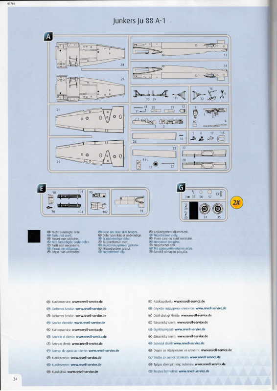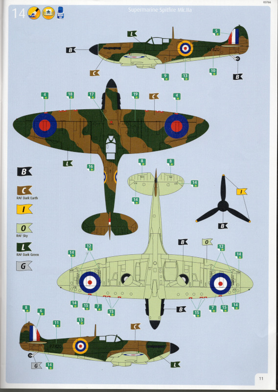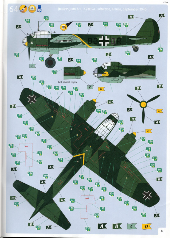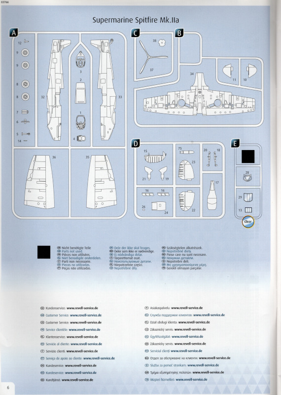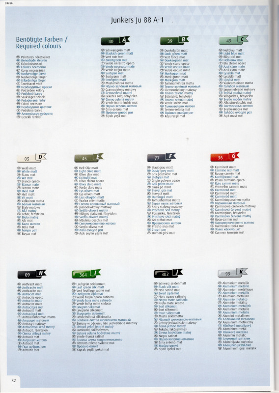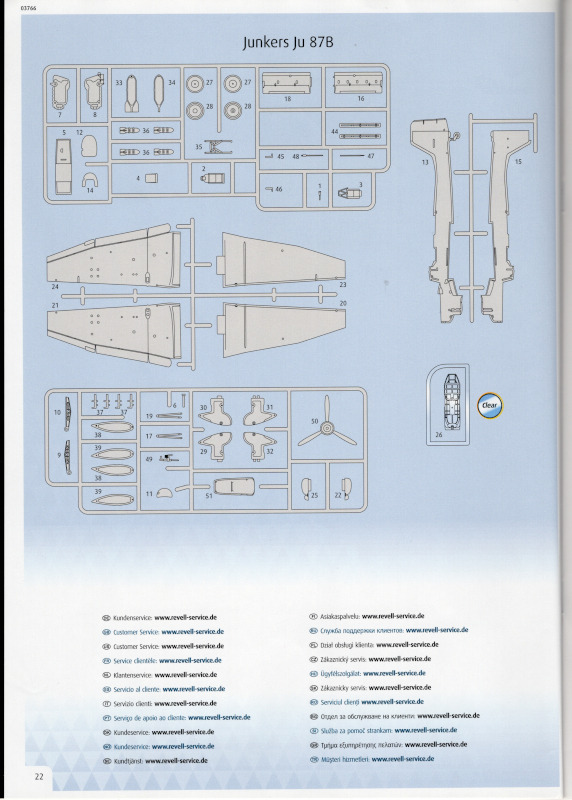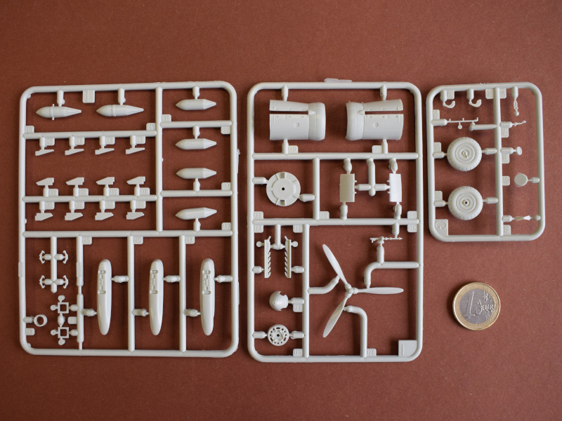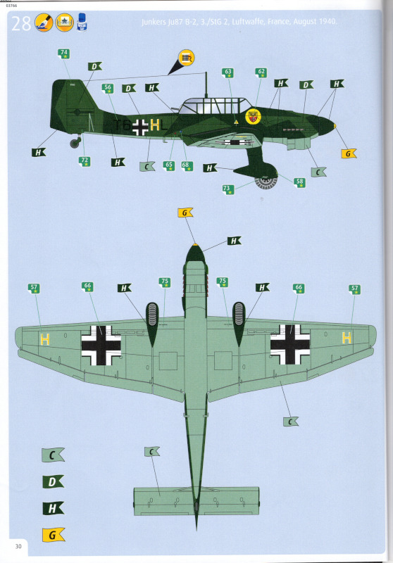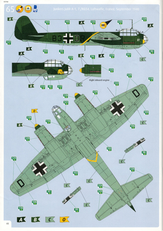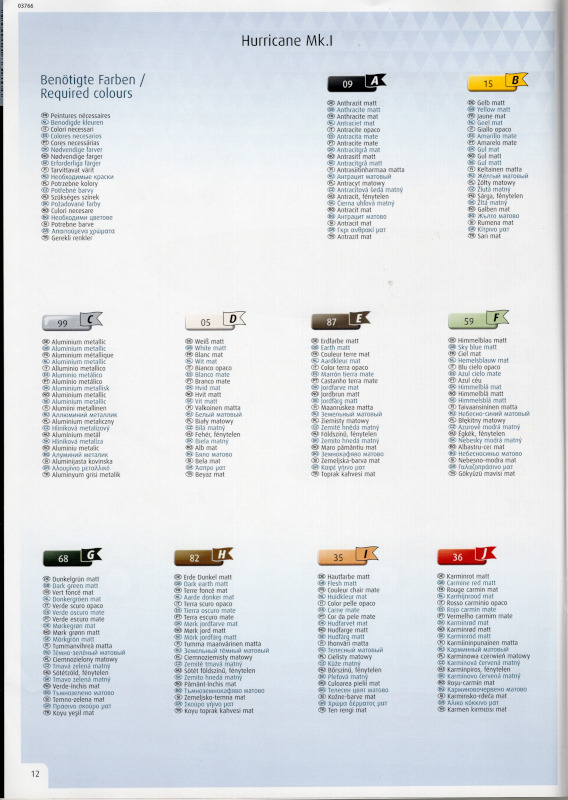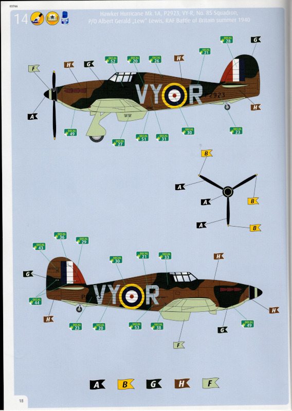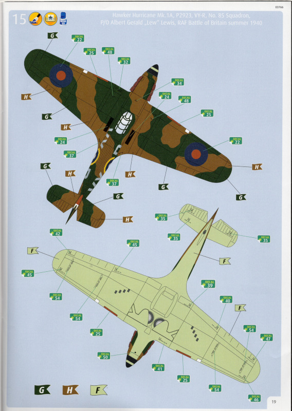 Der MarkierungsbogenDer Bogen ist die einzige Neuheit an diesem Bausatz. Die Markierungen sind glänzend und augenscheinlich fehlerfrei gedruckt. Bei der Spitfire Mk.IIa kann die Maschine mit der Werknummer P7420 dargestellt werden. Interessant ist, dass sie außer dieser Nummer keine weiteren Staffelmarkierungen trägt. Bei der Hurricane Mk.Ia kann die Werknummer P2923, Kennung VY-R, der No. 85 Sqn. dargestellt werden. Hier sind auch eine größere Anzahl an Wartungshinweisen enthalten. Die gleiche Maschine war auch im ersten Set von 2010 enthalten. Bei der Junkers Ju 87 B-2 kann die T6+HL der 3./StG 2 aus der Zeit August 1940 dargestellt werden. Auch hier sind ein paar Wartungshinweise enthalten. Die gleiche Maschine war auch im ersten Set von 2010 enthalten. Bei der Junkers Ju 88 A-1 kann die B3+DR der 7./KG 54 aus der Zeit September 1940 dargestellt werden. Hierfür entfallen die meisten Markierungen des gesamten Bogens. Zahlreiche Wartungshinweise warten darauf, verarbeitet zu werden. Zusätzlich ist zu erwähnen, dass Revell hier die Markierungen der 1:32er Version des Bausatzes verwendet hat. Darstellbare Maschinen: