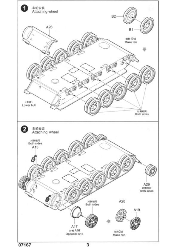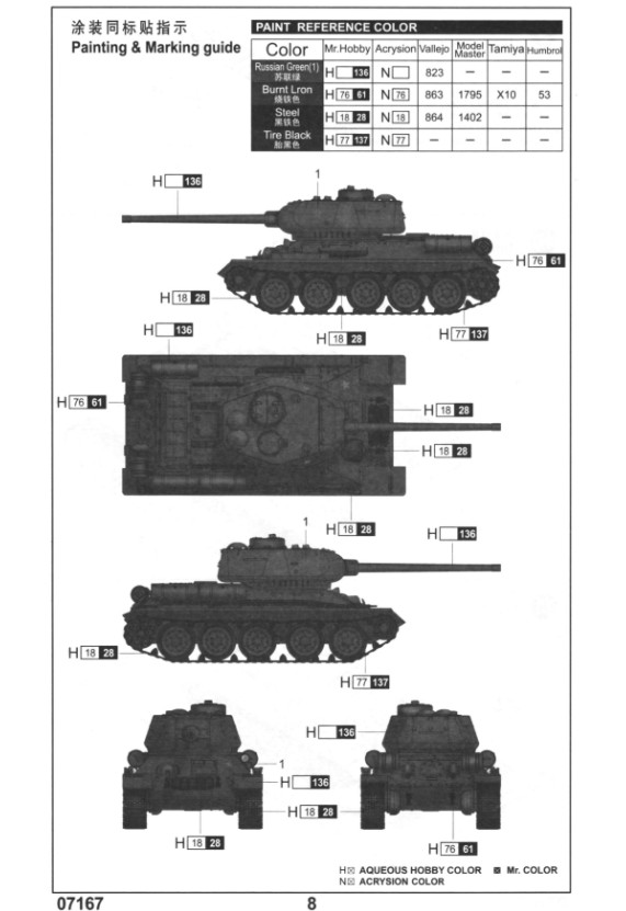 AnleitungDie achtseitige Bauanleitung soll einen in 11 Schritten zum Ziel bringen. Sie ist in Englisch und ohne Text selbsterklärend. Für die Bemalung gibt die Vorderseite des Kartons Hilfestellung. Die Farbangaben der Bauanleitung beziehen sich auf Vallejo, Acrysion, Mr. Hobby, Model Master, Tamiya und Humbrol.