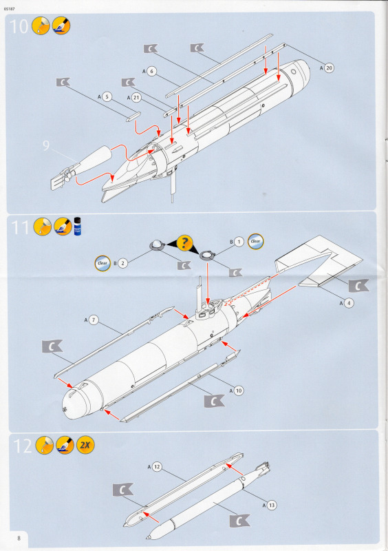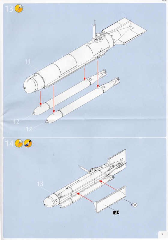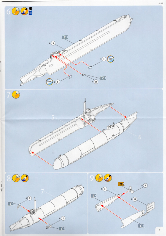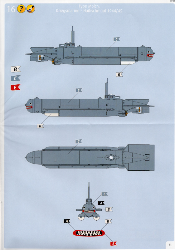Die BauanleitungDie Anleitung hat das Format A4 und besteht aus elf farbig gedruckten Seiten. 16 Baustufen führen bis zum fertigen Modell. Die Zeichnungen haben eine ausreichende Größe und sind leicht verständlich. Revell gibt fünf Farben für die Lackierung an. Revell legt dem Bausatz keinen Markierungsbogen bei. Das wäre nicht weiter tragisch, doch eine der beiden Lackierversionen trägt am Bug eine Art Haifischmaul. Hier soll wohl die Vorlage aus der Bauanleitung ausgeschnitten und als Schablone verwendet werden. Ob das bei den weniger erfahrenen Modellbauern zielführend ist, wage ich zu bezweifeln. Aber bei der Lackierung kann man auch auf andere Vorlagen zurückgreifen oder etwas kreativ werden. ICM hat seinem Bausatz einen Markierungsbogen beigelegt. Vielleicht wollte Revell hier die Kosten dafür sparen? Darstellbare Einheiten: