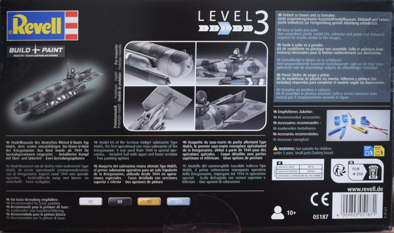 Der Molch im ModellbauDieses Kleinkampfmittel gab es zuerst von verschiedenen Herstellern in 1:35. Der kleinere Maßstab 1:72 wurde erst später von anderen Firmen bedient. Und hier war ICM der erste Hersteller, der einen Spritzgussbausatz in höherer Stückzahl auf den Markt brachte. Der BausatzDie Erstauflage des Bausatzes von ICM stammt aus dem Jahr 2023. Revell legt lediglich eine neue Bauanleitung mit bei. Aber zuerst fällt auf, dass Revell nicht mehr den Schüttkarton verwendet, sondern eine aufklappbare Verpackung. Sehr gut!! Der Spritzrahmen weist keine augenscheinlichen Fehler auf. Möglicherweise sind die Schweißnähte auf der Außenseite etwas zu stark ausgeprägt, aber das mag nur mein subjektives Empfinden sein. Sehr bemerkenswert ist, dass der Steuerraum des Molch angedeutet ist. Man hat auch die Option, die Einstiegsluke offen darzustellen. Aber vermutlich wird man später kaum etwas von der Inneneinrichtung erkennen. Wer sich Aufwand sparen möchte, schließt die Luke. Die Torpedos sind ganz gefällig detailliert. Wer es hier aber eine Nummer feiner bevorzugt (beispielsweise bei den Propellern) greift auf den Resin-Zubehörmarkt zurück. Der Displayständer ist funktional. Aber so ein kleines Modell in 1:72 verlangt förmlich nach der Darstellung in einem kleinen Diorama entweder an Land oder zu Wasser.
