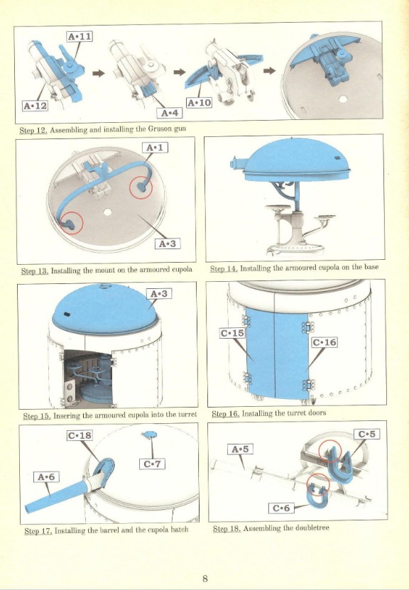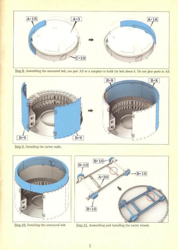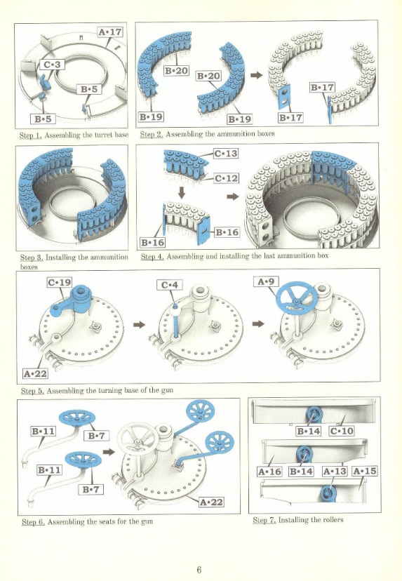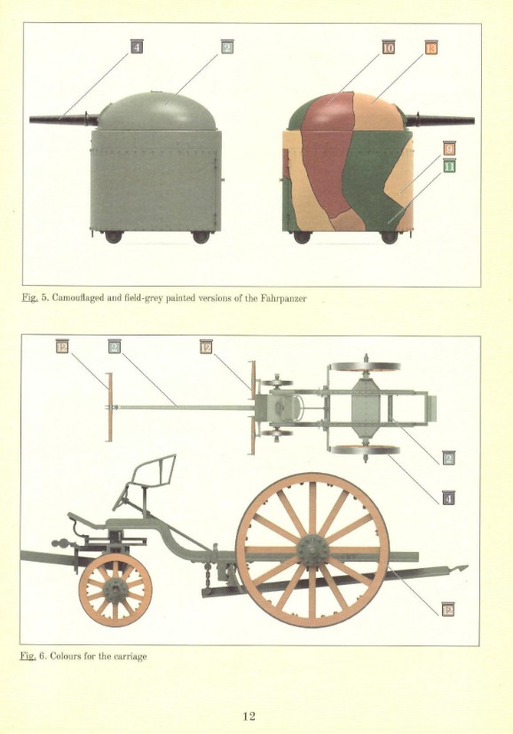 Der BauplanAuf 14 Seiten eines sehr ansprechenden, handlichen Heftes im Format 196 mm x 277 mm werden neben einem historischen Text (S.3, englisch) und fünf historischen Photographien (S.4) nach einer Teile- und Farbübersicht (S.5) die 33 Baustufen vorgestellt. Übersichtlichkeit ist hierbei Trumpf, wenig zu verbauende Teile pro Bauschritt, Führung über Icons und farbliche Hervorhebungen für anzubringende Teile sorgen dafür. Die Farbdarstellungen des Innenraums vom Fahrpanzer (S.11) und der Außenansicht der Fahrzeuge (S.12) sind vorbildlich.