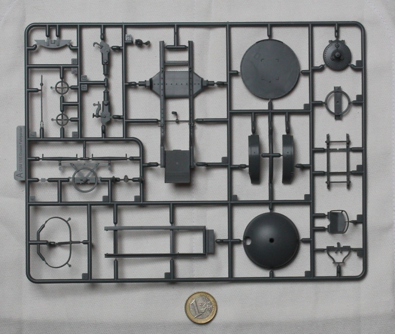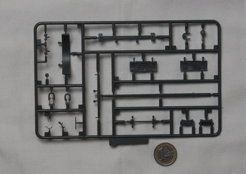 Die wenigen Bauteile des kleinen Modells sind stabil in Karton und sicher in Tütchen verpackt. Sie machen einen hervorragenden Eindruck und zeichnen sich durch eine sehr feine Detaillierung aus. Als Beispiele seien zahlreiche Niete als zeitgemäße Verbindungstechnik des Vorbilds, aber auch die Fahrzeugmechanik der „Kutsche“ genannt. Die Oberflächen des Panzerturms sind vorbildgerecht (Bleche) relativ glatt gespritzt, die Panzerkuppel hat eine sehr feine Struktur. Die Teile B3 und B4 wird ein engagierter Modellbauer womöglich gegen Kettchen austauschen wollen. Trotz aller lobenswerten Feinheiten wirkt der Bausatz mit seinen wenigen Teilen sehr übersichtlich, was an sich kein Nachteil sein muss. Die insgesamt 85 Teile sind auf vier Spritzlingsrahmen verteilt, wobei der Rahmen B zweimal vorhanden ist. Im Einzelnen umfasst der Bausatz: