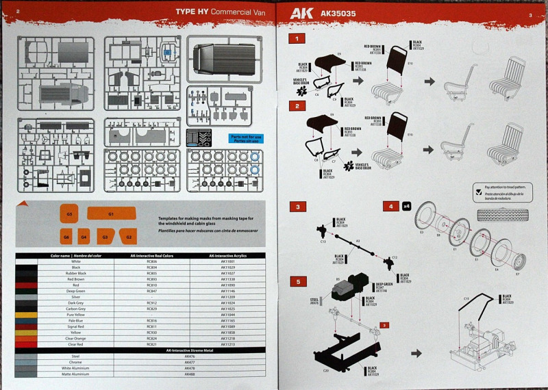 Der BauplanAuf 14 Seiten zeigt die Bauanleitung (englisch, spanisch) im Format A4 nach Sicherheitshinweisen einen Überblick über die Spritzrahmen, gefolgt von Lackiermasken als gedruckte Vorlagen. Den ersten Teil beschließt ein Farbschlüssel mit Angaben zu zwei hauseigenen Produkten und Metallfarben. Immerhin sind diese über den Versandhandel greifbar. Auf neun Seiten wird danach recht übersichtlich und über Icons – selbsterklärend, was zu tun ist – in 20 Bauschritten der Weg zum fertigen Modell aufgezeigt, bevor auf vier Seiten die im Bausatz vorgesehenen Varianten in fünf Ansichten gezeigt werden - vorbildlich. Die Farbhinweise neben den Abbildungen auf S.11ff wird mancher als hilfreich empfinden, das lästige Hin- und Herblättern entfällt. Hinweise auf AK-Alterungsprodukte kann man als zusätzlichen Service verstehen.