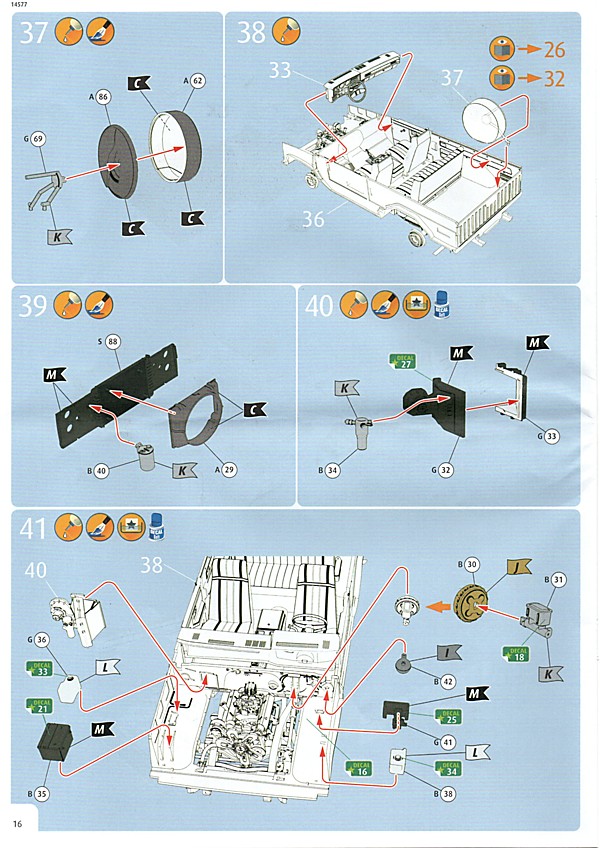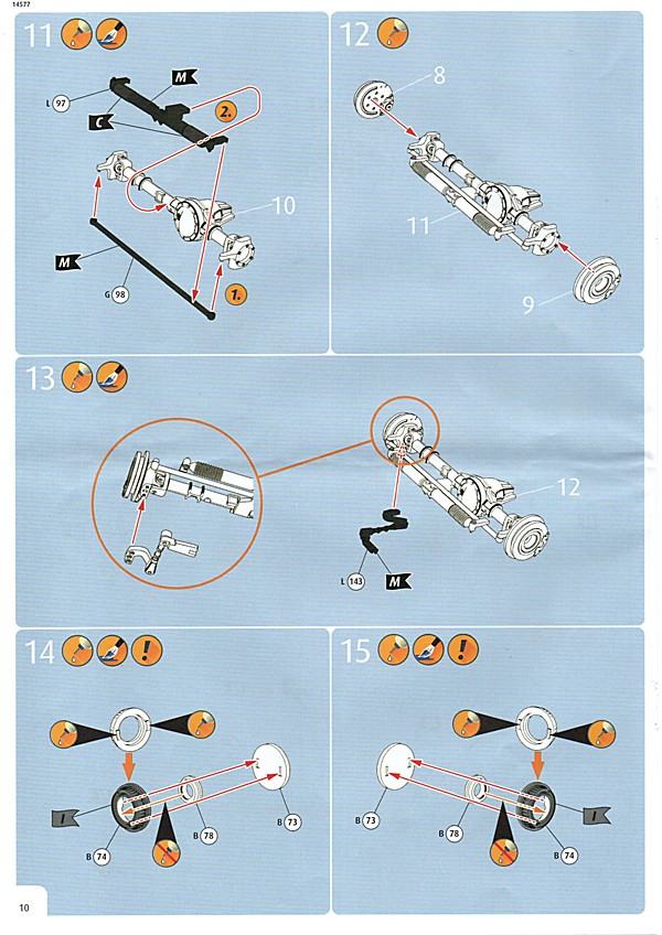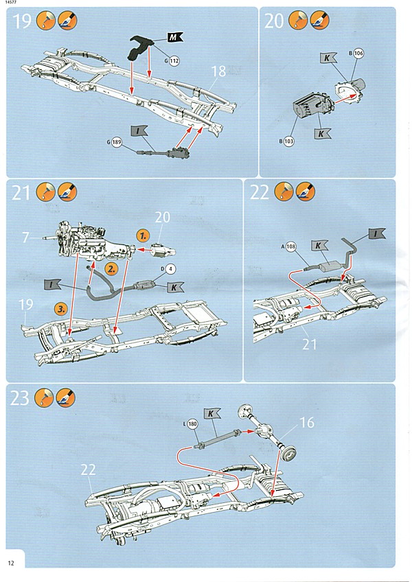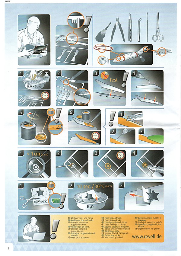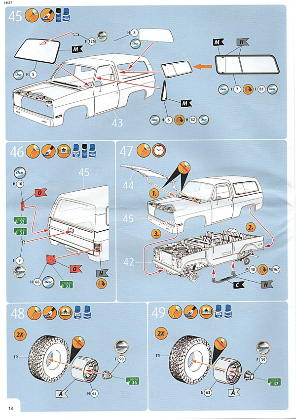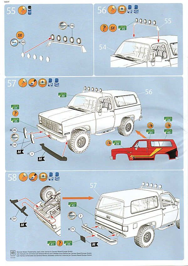 Bei den Revell USA-Bausätzen scheint nun, was die Bauanleitung angeht, die Zeitenwende eingeläutet worden zu sein. Dies ist das erste Mal, dass eine farbige Anleitung beigelegt worden ist. Inhaltlich hat man sich den europäischen Anleitungen angepasst, so gibt es neben der Revell USA-typischen Bauteileliste auch eine Übersicht über die Teilerahmen (mit geschwärzten Teilen, die nicht benötigt werden). Die Bemalungshinweise sind jetzt auch farblich hervorgehoben, so wie man es hierzulande schon länger kennt. Die Baustufen wurden aufgelockert, vorbei sind die Zeiten, wo zum Teil zweistellige Bauteilezahlen pro Baustufe gebraucht wurden. Was es nicht gibt, ist eine Bemalungsanleitung für das ganze Fahrzeug; die entsprechenden Hinweise, welche Decals wo hin gehören, wurden in die einzelnen Schritte integriert. Der Decalbogen ist für so ein aufwändiges Modell recht klein ausgefallen, teilweise liegt das aber an den nur spärlich vorhandenen Zierstreifen und Nummernschildern. Dafür gibt es aber reichlich kleine Schildchen und Embleme, die dem fertigen Modell den letzten Detailkick verschaffen. Eine Sache, die mich bei den Revell USA-Bögen immer wieder stört, ist das sichtbare Druckraster. Bei Metallfarben ist das besonders ausgeprägt, man sieht es aber auch auf den größeren Flächen.