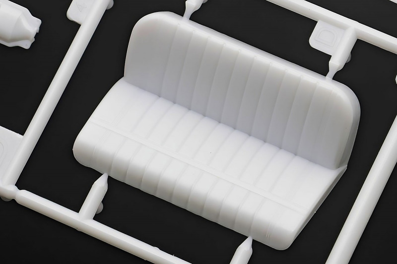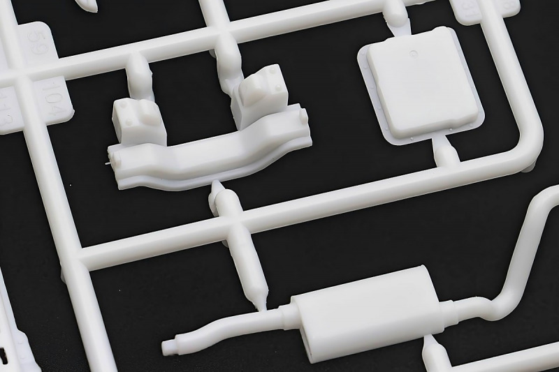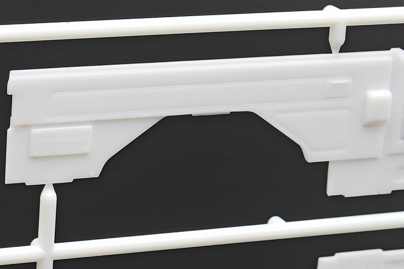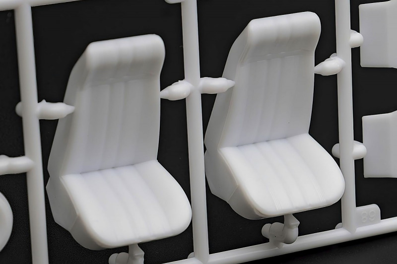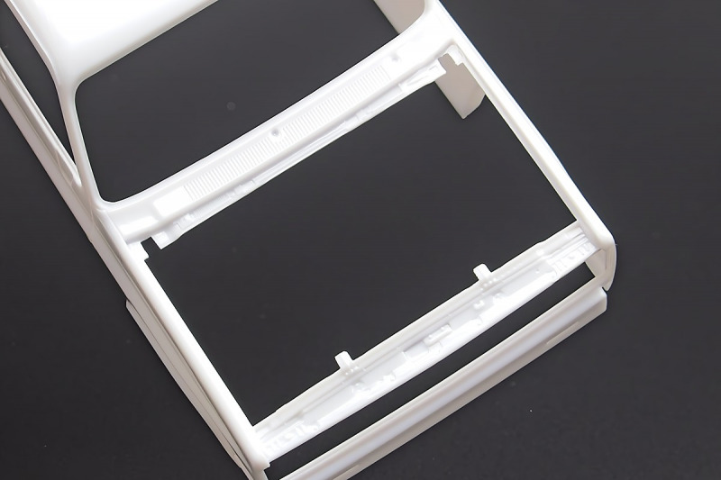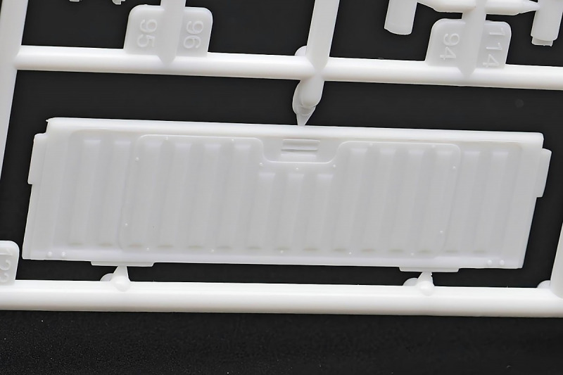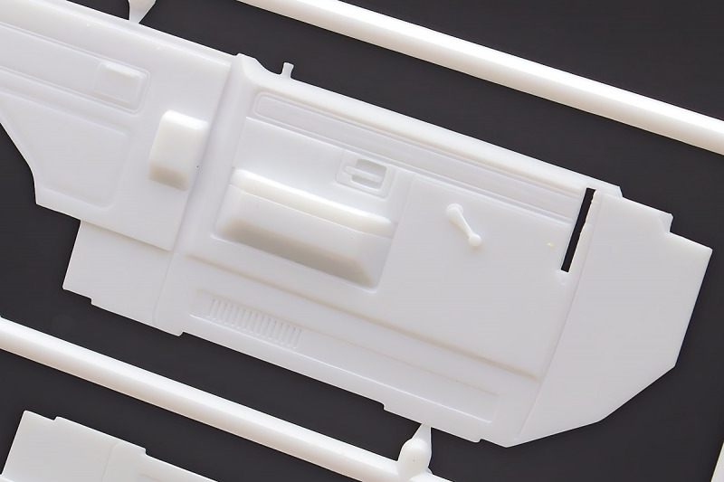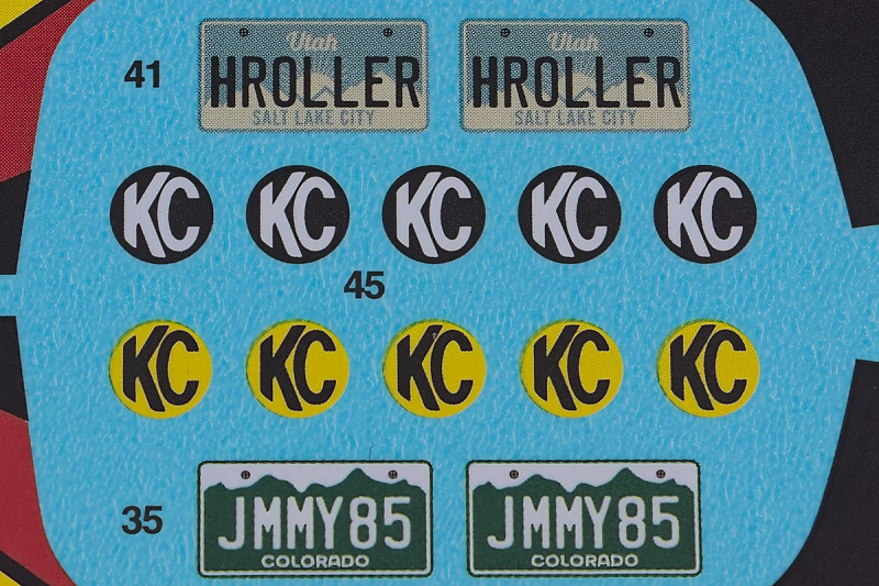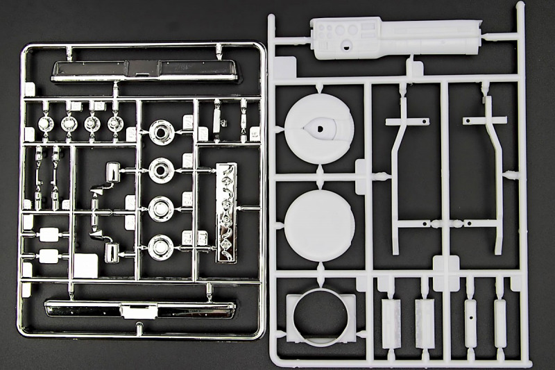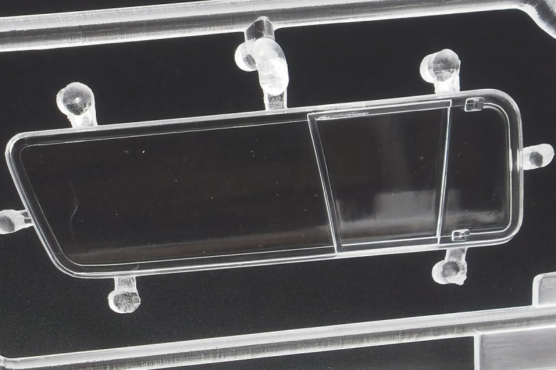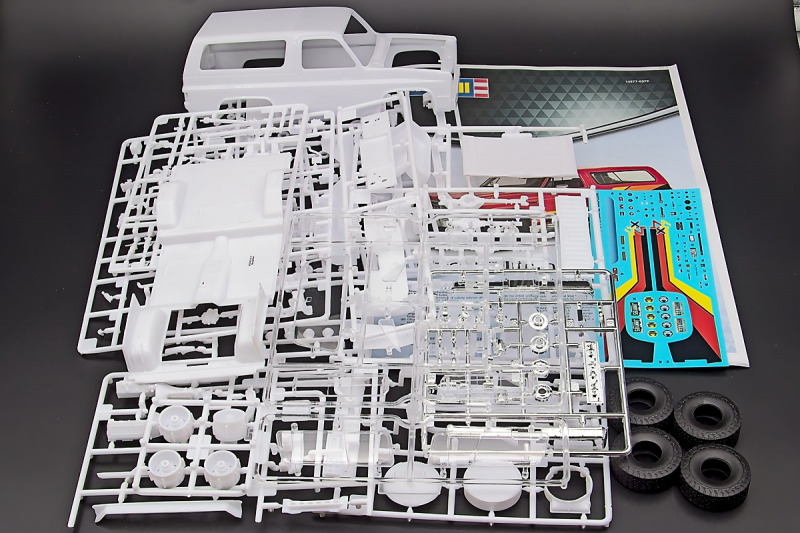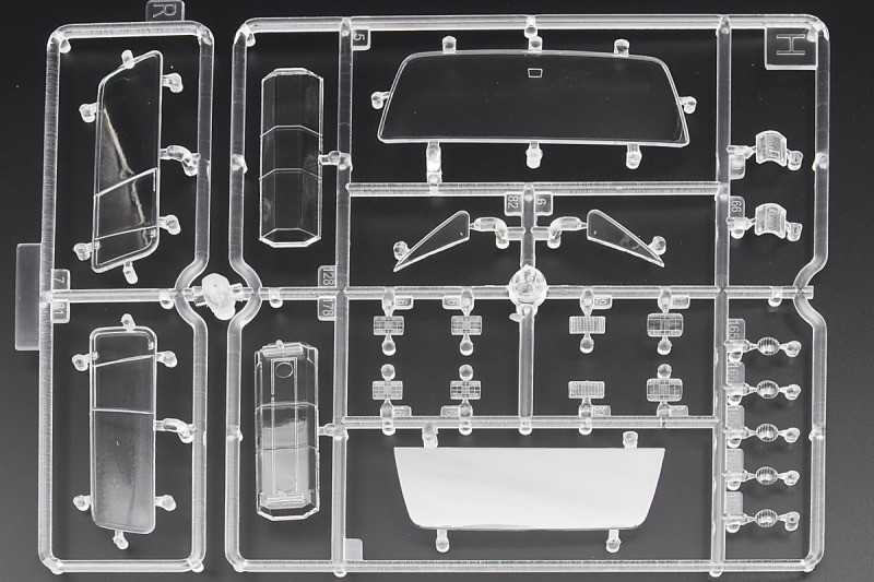 Bei den Chromteilen hat man sich auf das Wesentliche beschränkt: Spiegel, Türgriffe Stoßstangen und ein paar Teile für die Räder. Ich bin zwar kein Freund von solchen Teilen, hier jedoch gibt es nix zu meckern. Keine störenden Grate oder Fischhaut (wie sonst üblich) und auch die Angüsse sind erstens klein und zweitens halbwegs günstig platziert. Die Klarsichtteile machen einen sehr guten Eindruck, schön dünn, glasklar und schlierenfrei. Wie üblich gibt es keine Fenster für die Türen, alle anderen sind jedoch vorhanden. Sämtliche Leuchtengläser, auch die der Scheinwerferbatterie auf dem Dach sind ebenfalls als Klarsichtteile ausgeführt. Nett, die Polizeileuchte aus dem Stranger Things-Modell ist noch da :). Bleiben noch die Gummireifen, hier haben wir jetzt gegenüber vorher richtig fette, grobstollige Geländereifen. Die Felgen sind ebenfalls neu und ganz klassisch 80´er Jahre Design.