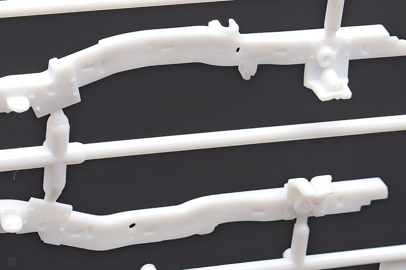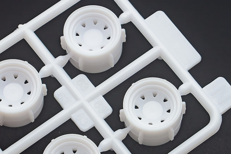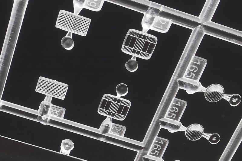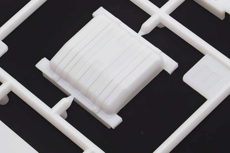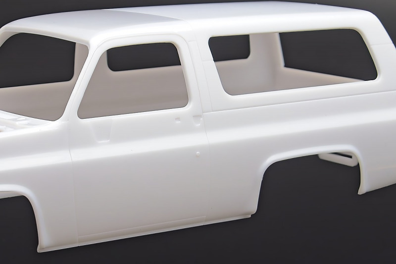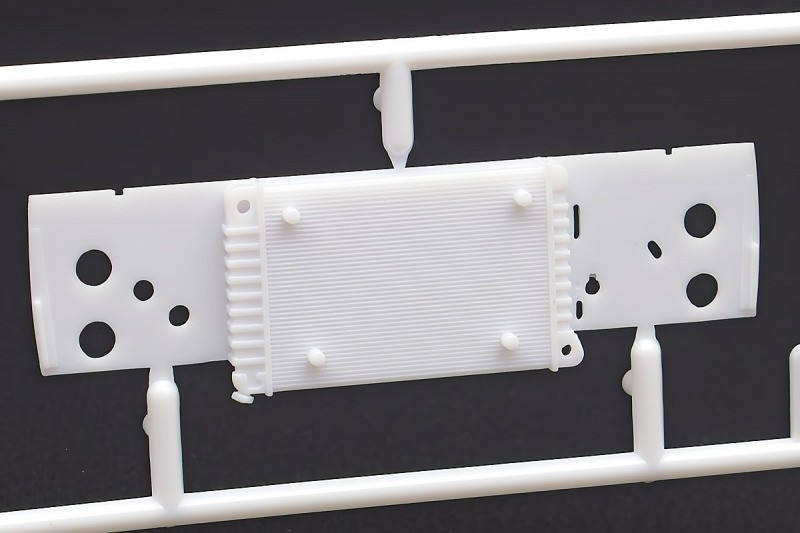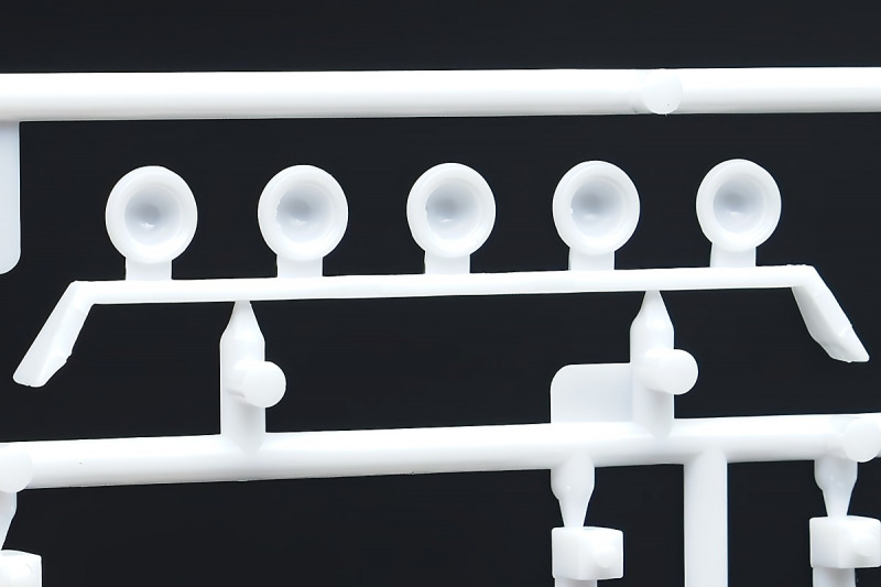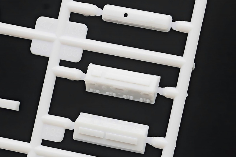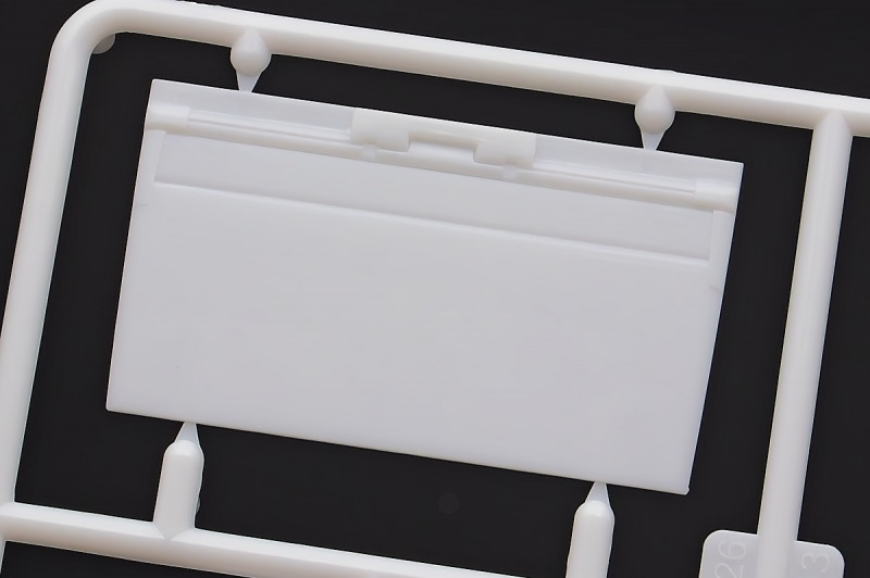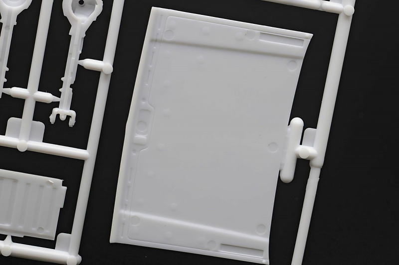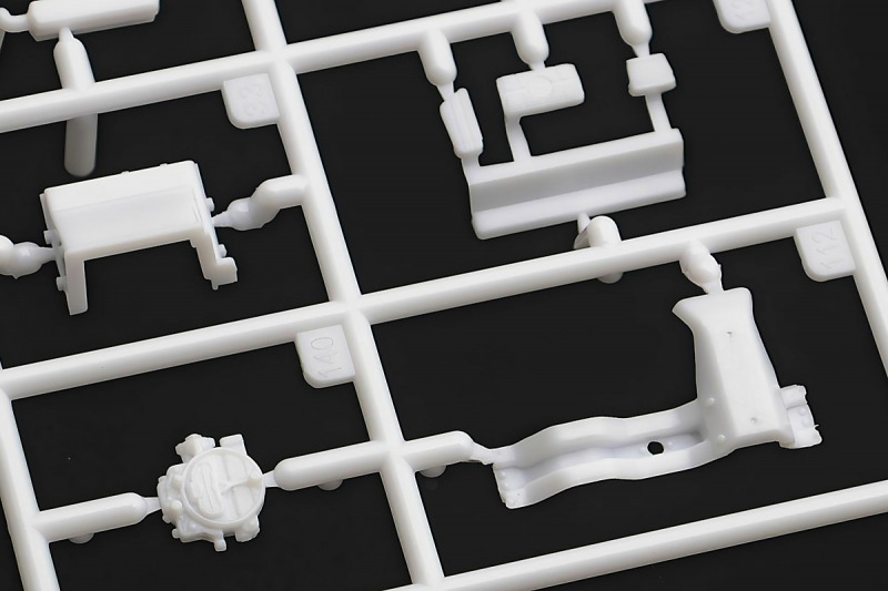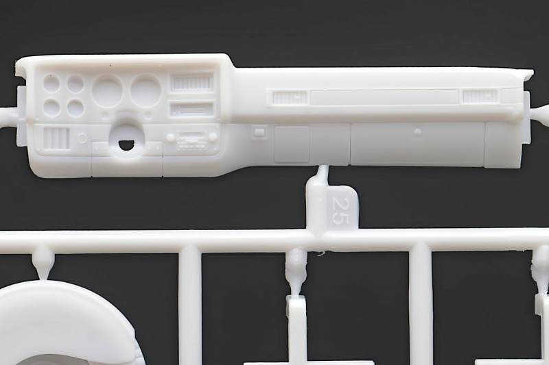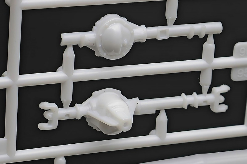 Bei den Chromteilen hat man sich auf das Wesentliche beschränkt: Spiegel, Türgriffe Stoßstangen und ein paar Teile für die Räder. Ich bin zwar kein Freund von solchen Teilen, hier jedoch gibt es nix zu meckern. Keine störenden Grate oder Fischhaut (wie sonst üblich) und auch die Angüsse sind erstens klein und zweitens halbwegs günstig platziert. Die Klarsichtteile machen einen sehr guten Eindruck, schön dünn, glasklar und schlierenfrei. Wie üblich gibt es keine Fenster für die Türen, alle anderen sind jedoch vorhanden. Sämtliche Leuchtengläser, auch die der Scheinwerferbatterie auf dem Dach sind ebenfalls als Klarsichtteile ausgeführt. Nett, die Polizeileuchte aus dem Stranger Things-Modell ist noch da :). Bleiben noch die Gummireifen, hier haben wir jetzt gegenüber vorher richtig fette, grobstollige Geländereifen. Die Felgen sind ebenfalls neu und ganz klassisch 80´er Jahre Design.