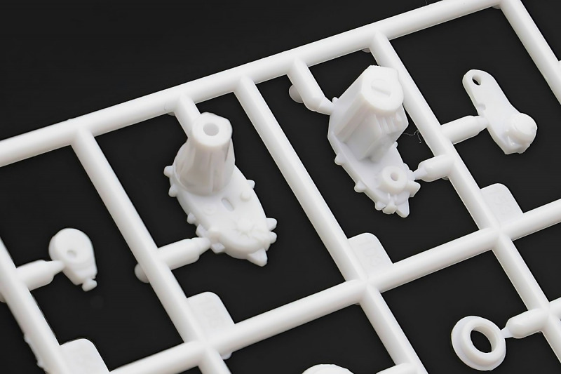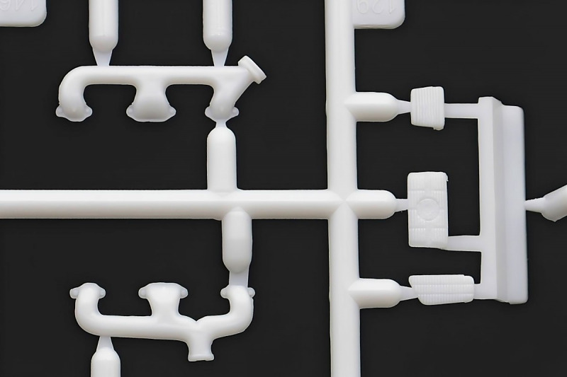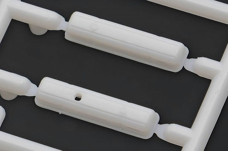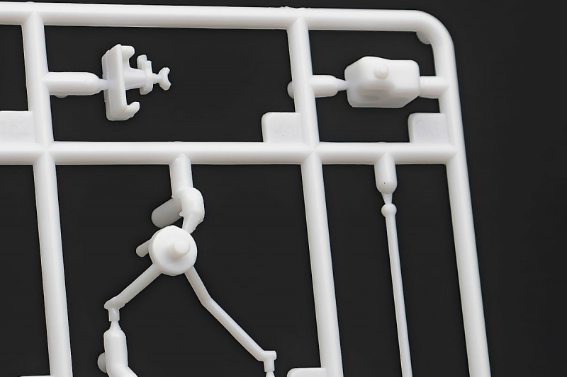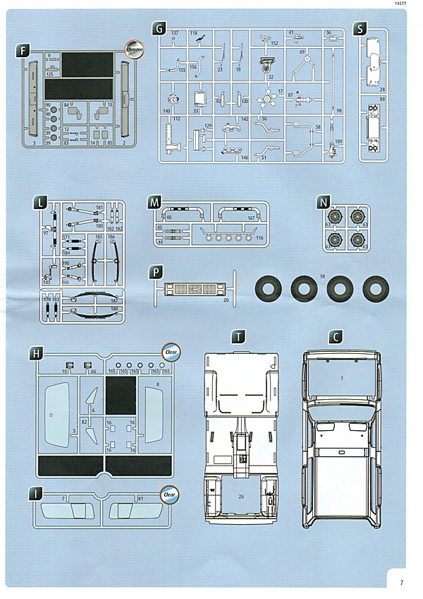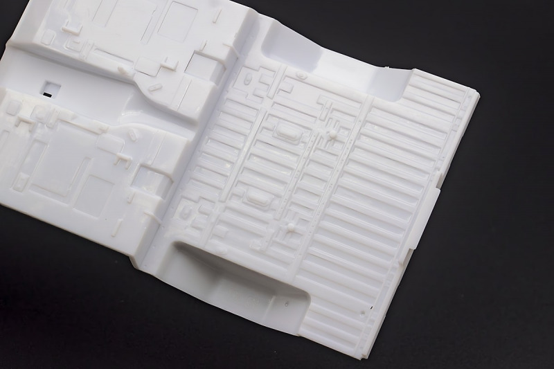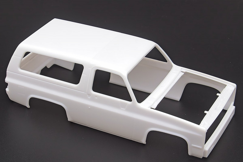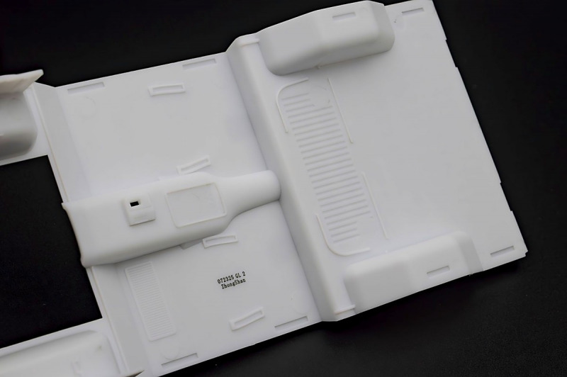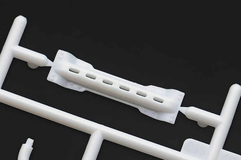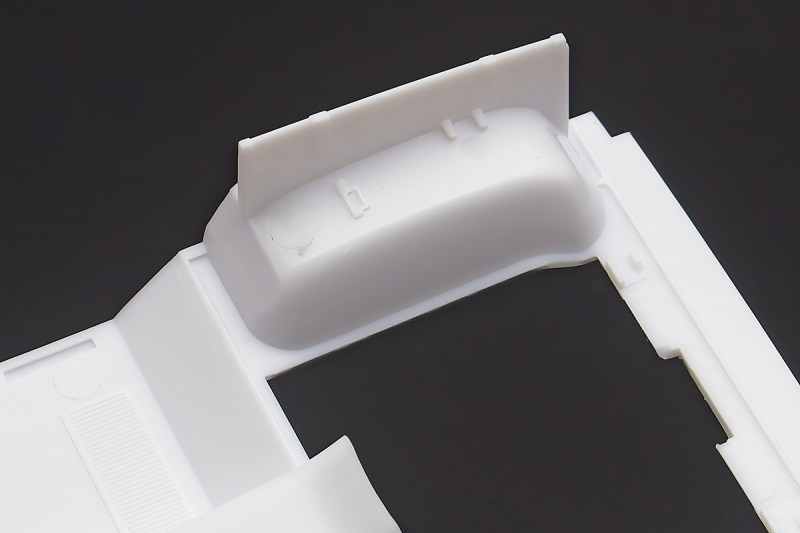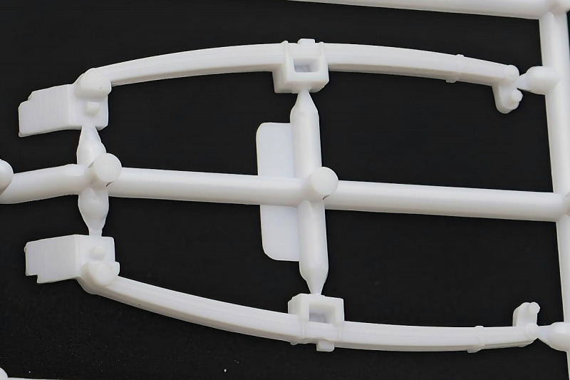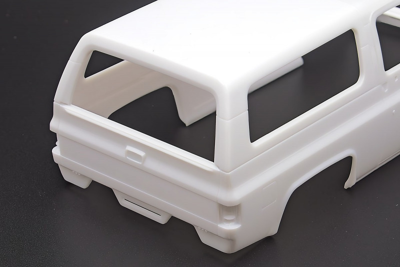 Bei den Chromteilen hat man sich auf das Wesentliche beschränkt: Spiegel, Türgriffe Stoßstangen und ein paar Teile für die Räder. Ich bin zwar kein Freund von solchen Teilen, hier jedoch gibt es nix zu meckern. Keine störenden Grate oder Fischhaut (wie sonst üblich) und auch die Angüsse sind erstens klein und zweitens halbwegs günstig platziert. Die Klarsichtteile machen einen sehr guten Eindruck, schön dünn, glasklar und schlierenfrei. Wie üblich gibt es keine Fenster für die Türen, alle anderen sind jedoch vorhanden. Sämtliche Leuchtengläser, auch die der Scheinwerferbatterie auf dem Dach sind ebenfalls als Klarsichtteile ausgeführt. Nett, die Polizeileuchte aus dem Stranger Things-Modell ist noch da :). Bleiben noch die Gummireifen, hier haben wir jetzt gegenüber vorher richtig fette, grobstollige Geländereifen. Die Felgen sind ebenfalls neu und ganz klassisch 80´er Jahre Design.