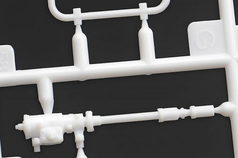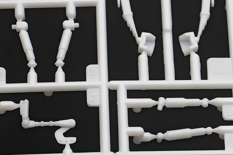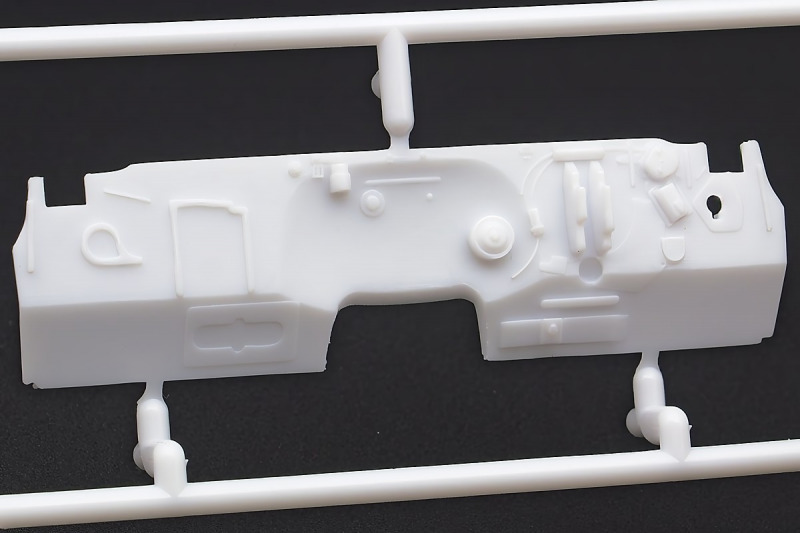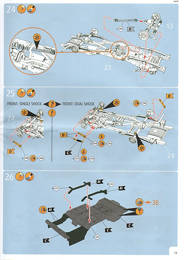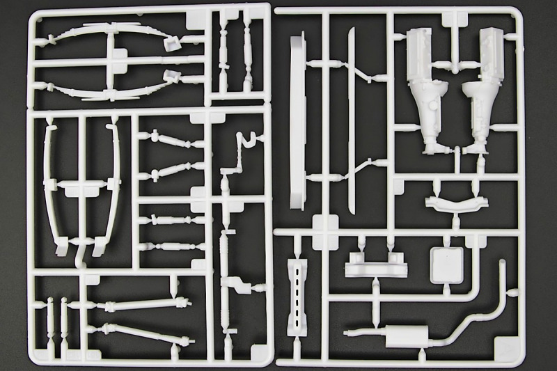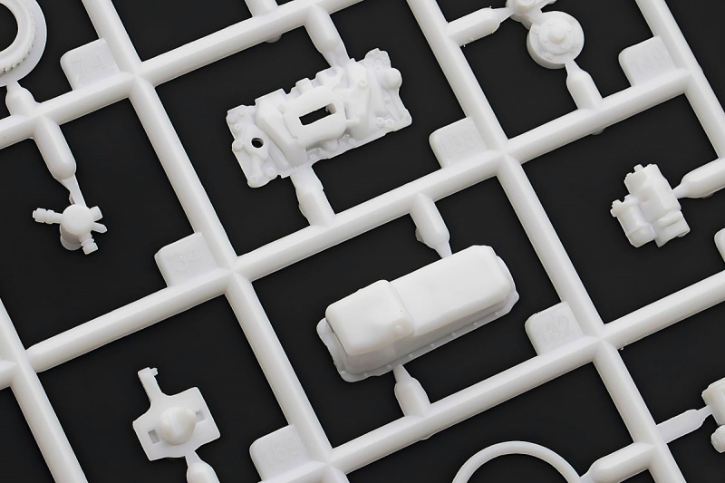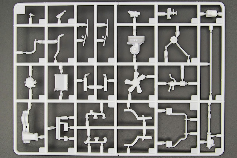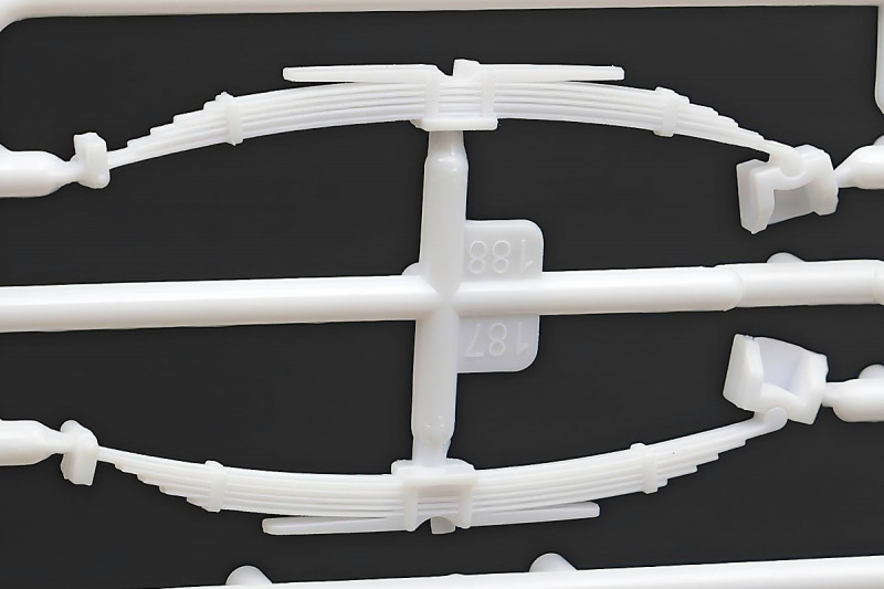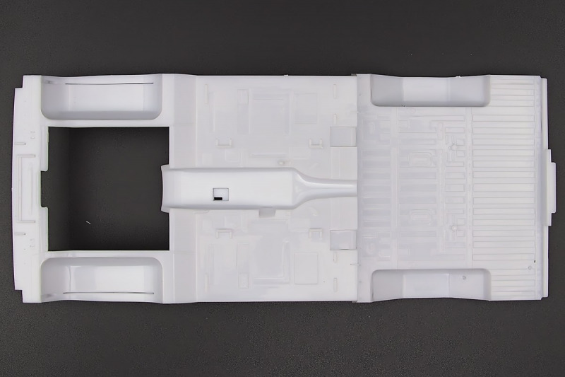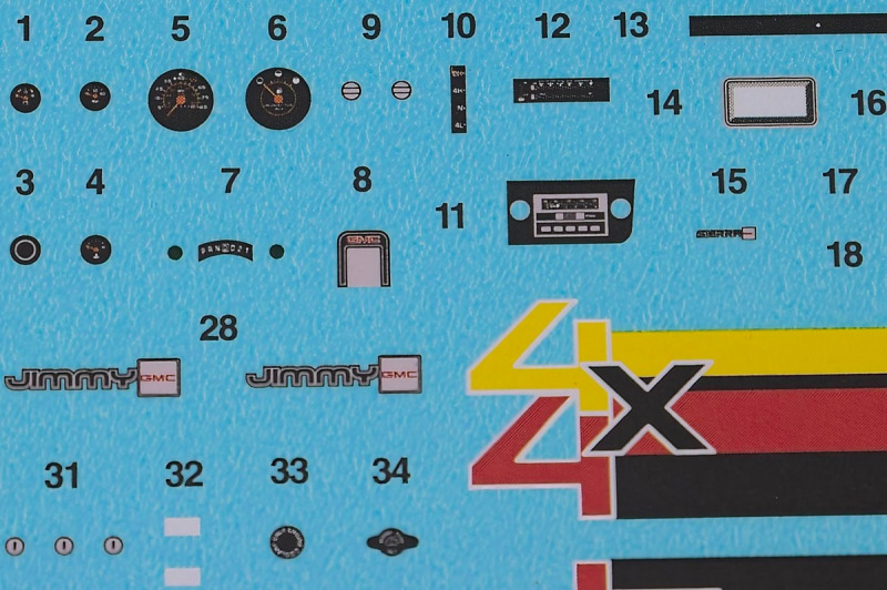 Weiter geht´s mit den Achsen, wie schon erwähnt, kann man sich an der Vorderachse für ein oder zwei Paar Stoßdämpfer entscheiden. Die Räder können drehbar angebaut werden, wer zusätzlich noch einen Lenkeinschlag darstellen möchte, muss improvisieren. Der Leiterrahmen wird aus mehreren Teilen aufgebaut und zusammen mit Fahrwerk und Motor als eigenständige Baugruppe fertiggestellt. Im Innenraum hat sich Revell besonders viel Mühe gegeben, ein ordentliches Ergebnis abzuliefern. Keine "Decal-Details", wie sonst oft üblich, sondern sauber geprägte Details wie z.B. Türgriffe, Lüftungsschlitze oder Fensterkurbeln. Ohne Decals geht´s natürlich nicht, viele davon für´s Armaturenbrett. Schade, Jim Hoppers Hut ist nicht mehr dabei, wäre er doch ein hübsches Accessoire für die Sitze gewesen.