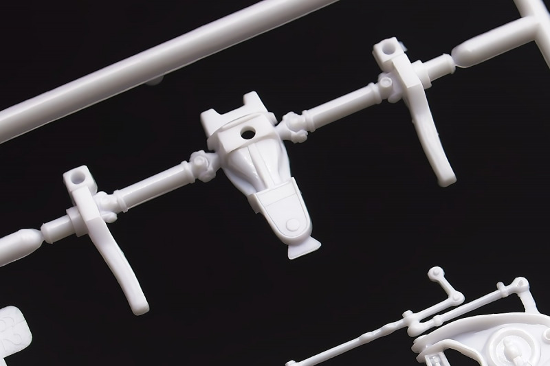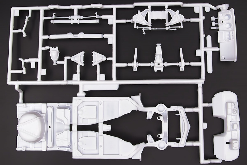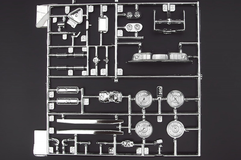 Der Motor besteht aus knapp 20 Einzelteilen und nimmt in einem ebenfalls sehr gut gemachten Motorraum Platz. Spritzwand und die Seitenwände sind separate Teile und mit einigen erhabenen Details versehen. Die Achsen werden aus mehreren Teilen aufgebaut. Netterweise hat man die Vorderachsfedern ebenfalls separat gelassen, so kann man sie einfach gegen richtige Federn austauschen (die Bausatzteile sind vertikal geteilt).